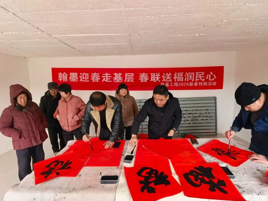 活动在庄园街道、观里镇同步开展。庄园街道宫后村与小石岭村活动现场,红联铺展、笔墨飘香,浓浓的年味扑面而来。书法家们凝神挥毫,“春回大地千山秀,福降人间万户欢”“马踏祥云开锦绣,春临沃野展宏图”等一副副寓意吉祥的春联跃然纸上,墨香与红纸相映,勾勒出十足的新春气息。
