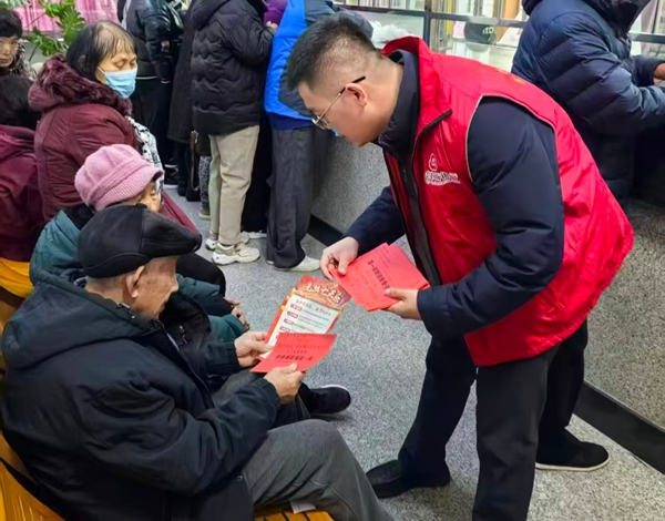 发放当日,支行党支部书记带队奔赴现场,全程参与资金押送与兑付工作。党员工作人员与村委干部密切配合,逐一核对老年村民身份信息,有条不紊办理领款手续;针对老年客户行动不便、易焦虑的特点,党员客户经理主动承担秩序维护、引导协助等工作,耐心帮扶高龄老人完成领款流程。同时,党员志愿者紧抓服务契机,向村民发放存款产品宣传折页,讲解定期存款、大额存单的利率优势,推介“存贷联动”惠民政策,引导大家合理规划资金,切实做好存款回行工作。