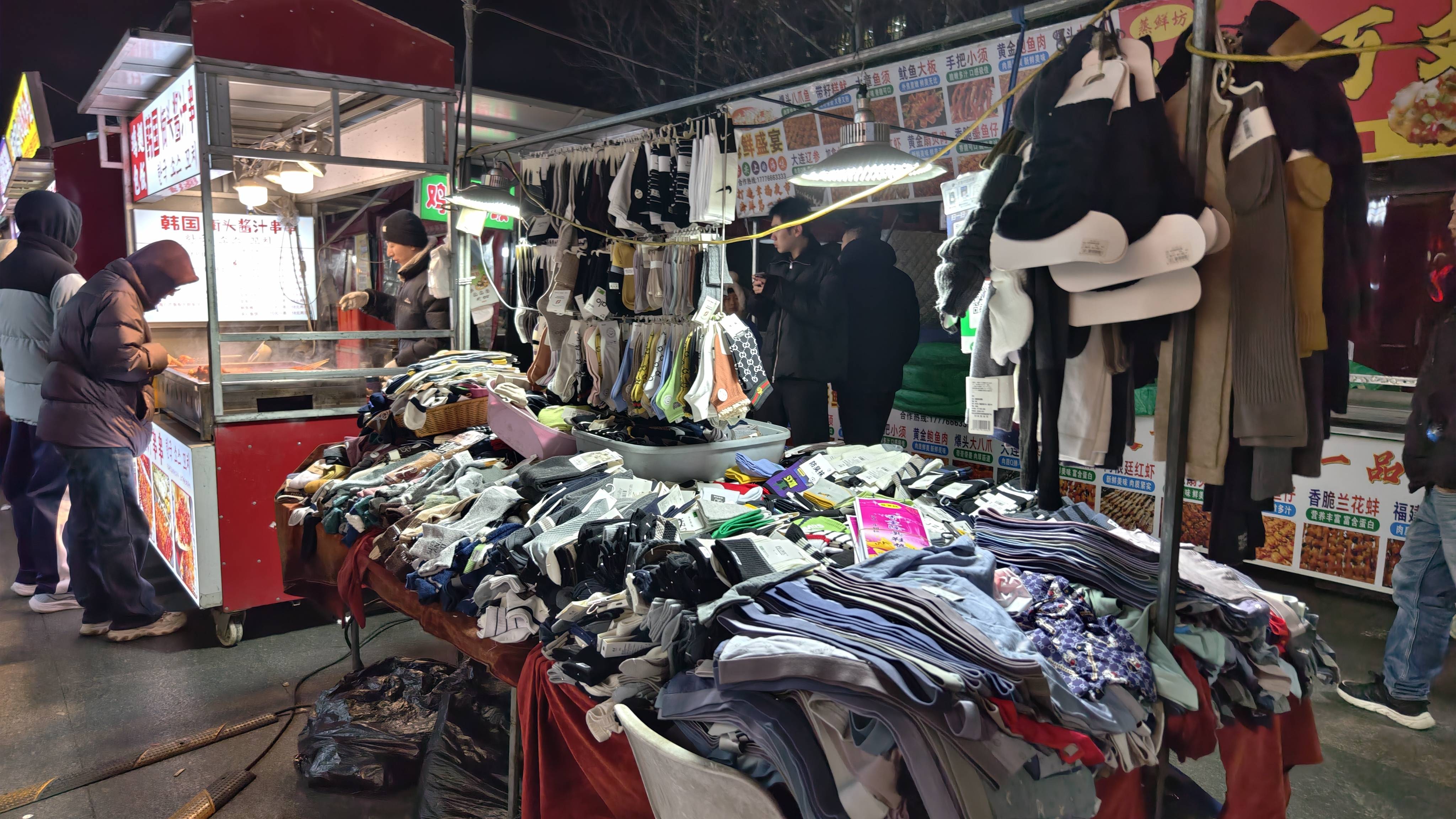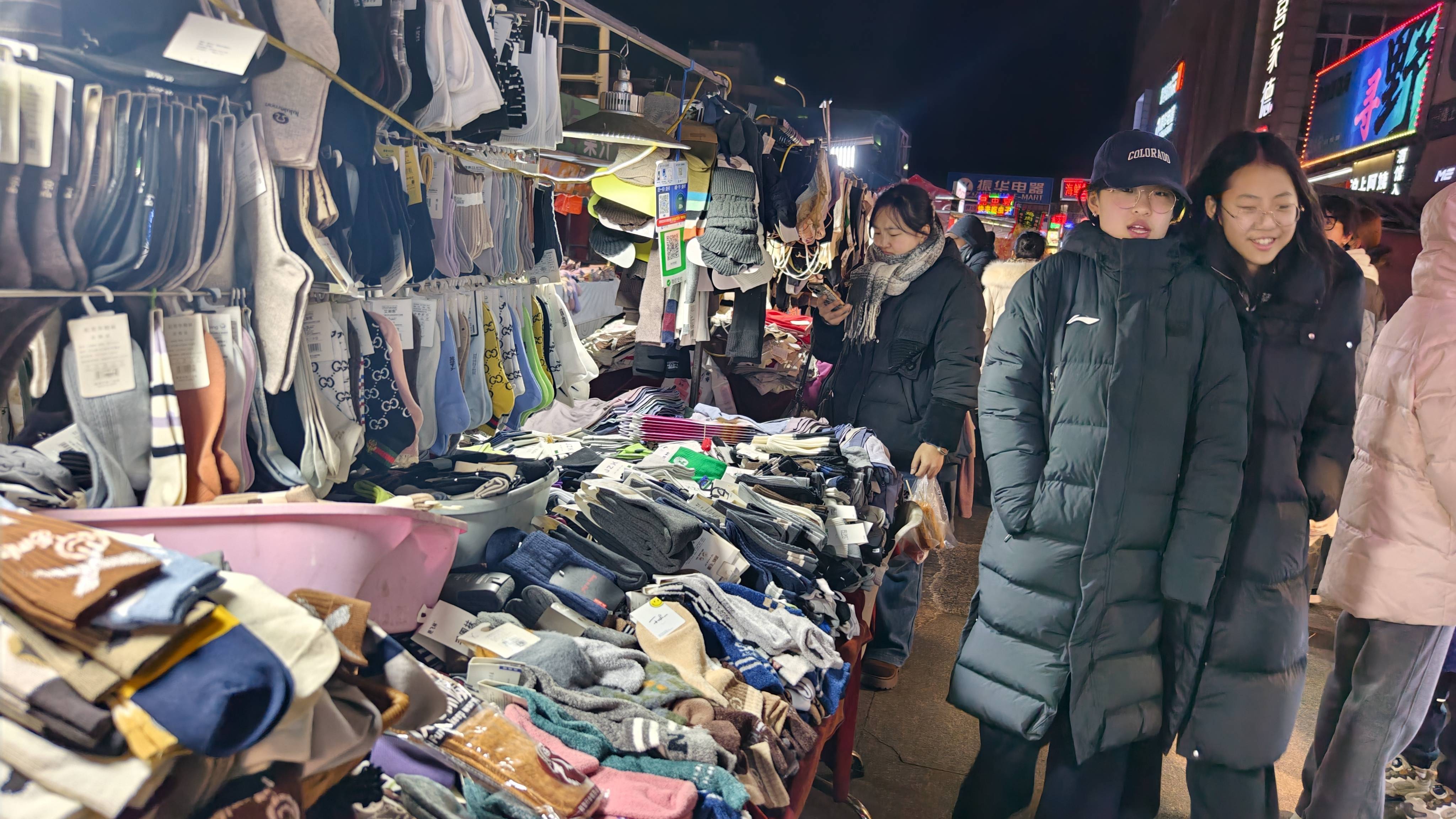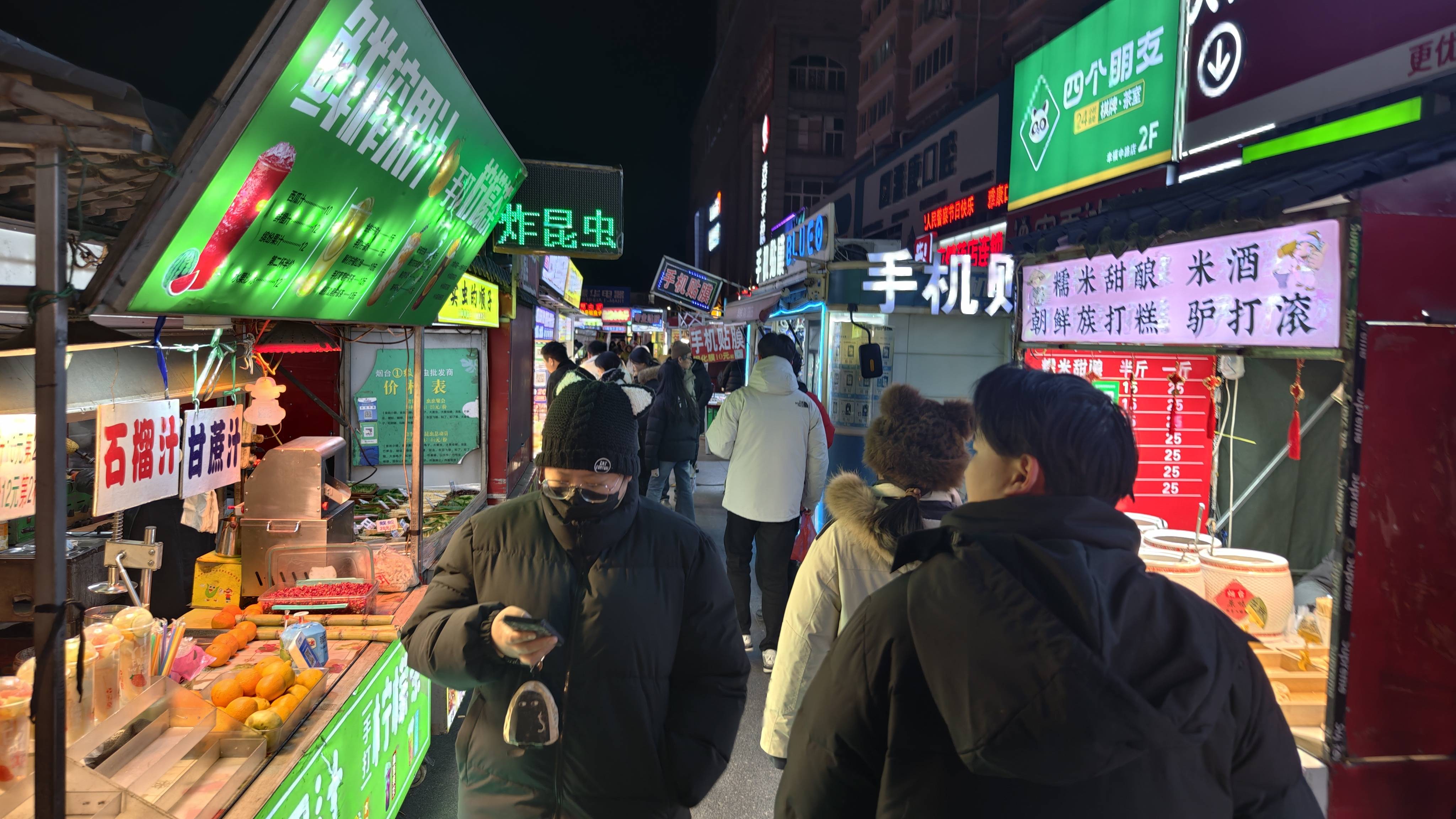 “臭豆腐两份,微辣!”“烤玉米好了,小心烫!”摊主们忙碌的身影在蒸腾的热气中若隐若现。虽然温度已降至零下,但这里的烟火气却丝毫未减。晚上接近十点,人流依旧络绎不绝,这样的热闹到了周末能持续到深夜十一点。