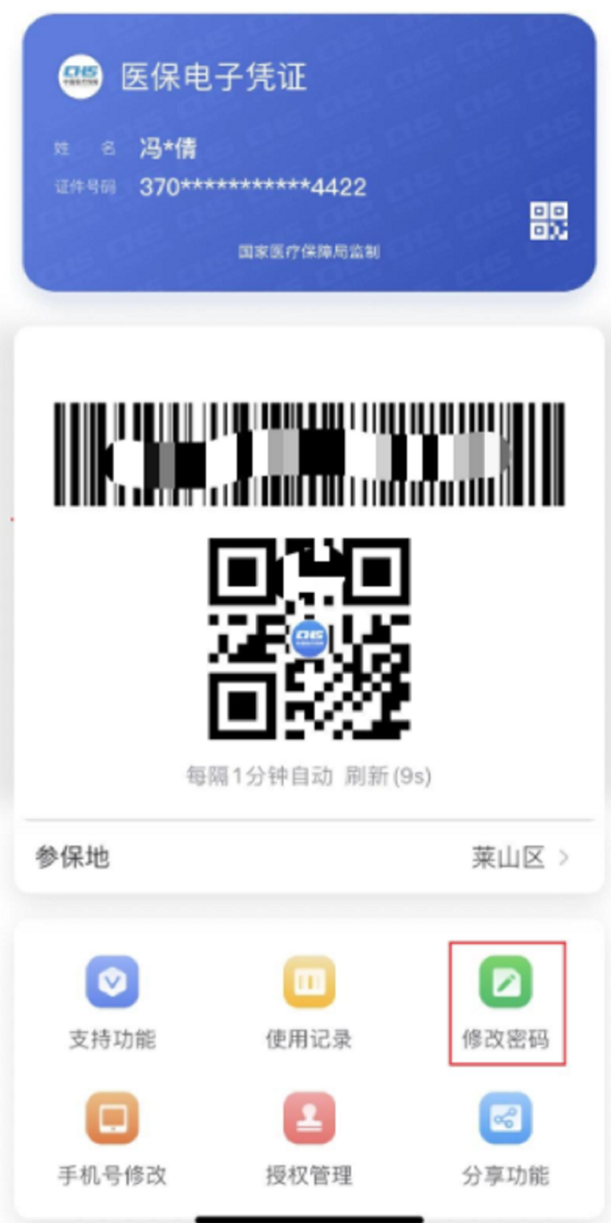 下载并登录国家医保服务平台APP,在首页底部点击中间【二维码】图标或者直接点击【医保码】功能按钮,进入医保码展码页面,展码页面下方找到【修改密码】按钮,点击后扫脸即可重置密码。
