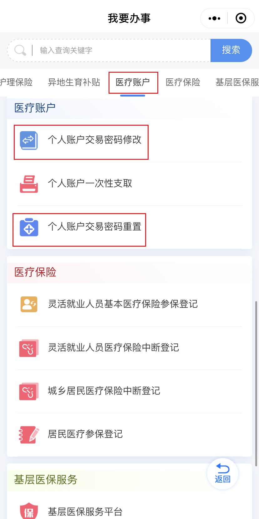 打开支付宝,搜索栏录入“烟台医保”,点搜索,进入“烟台医保”小程序,点击【我要办事】—【医疗账户】,先点击【个人账户交易密码重置】重置密码,再点击【个人账户交易密码修改】即可完成修改。