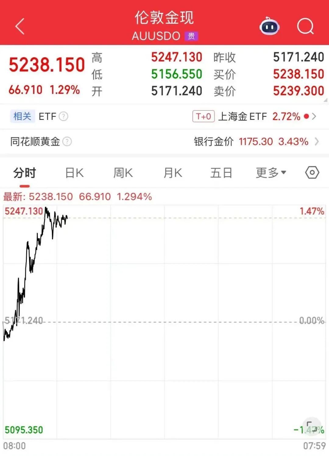 1月28日,现货黄金持续走高,首次突破5200美元/盎司。招金黄金、四川黄金、湖南黄金、中国黄金等多只个股涨停,晓程科技涨超20%。
