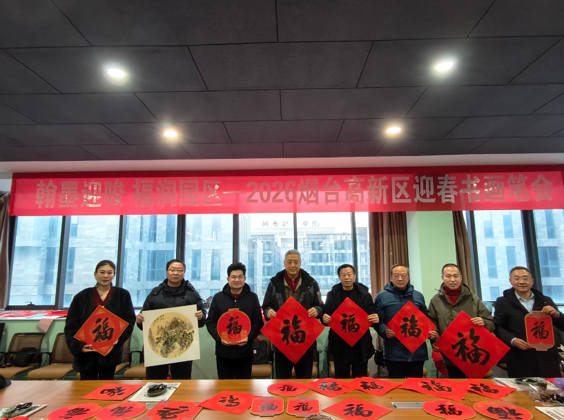 烟台融媒1月29日讯(通讯员 李庆东)笔墨传情迎新春,文化赋能启新程。2026年1月26日恰逢农历腊八,翰墨迎骏 福润园区——2026烟台高新区迎春书画笔会在烟台北航科技园二楼会议室温情启幕。活动邀请全市7名知名书画家挥毫泼墨,书写春联福字,创作国画小品,为园区企业送上饱含马年祝福与艺术底蕴的文化盛宴。