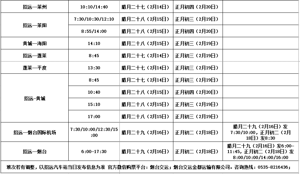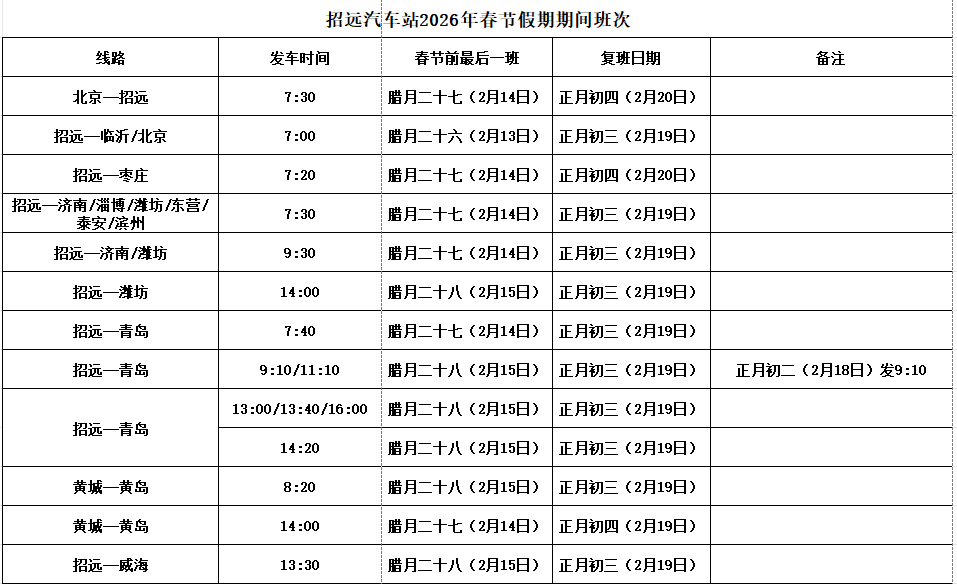 招远汽车站2026年春节假期班次安排来啦