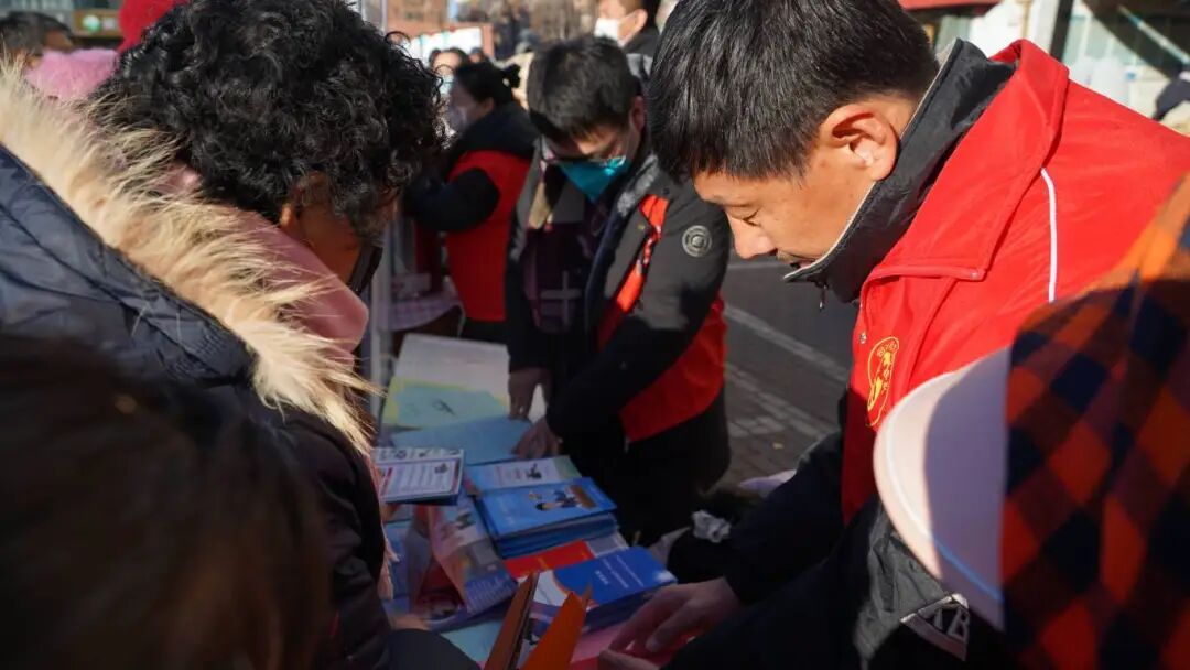 志愿者现场发放“福”袋。居民朋友们可以免费享受量血压、医疗咨询便民服务。