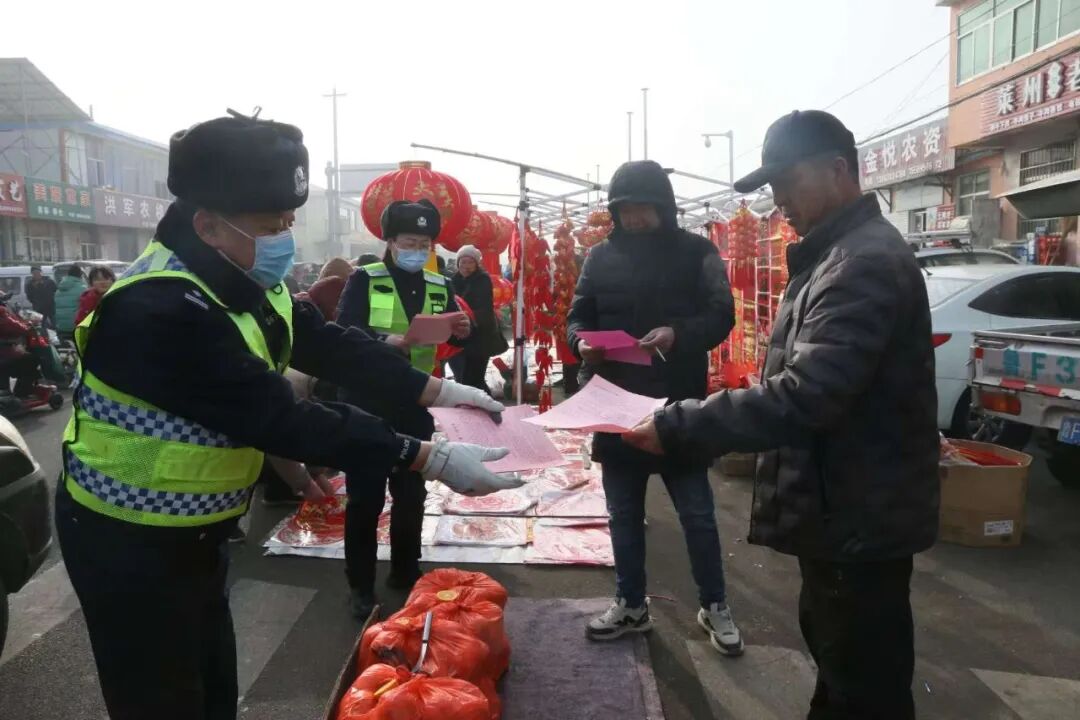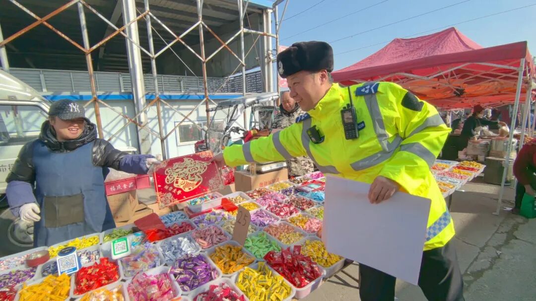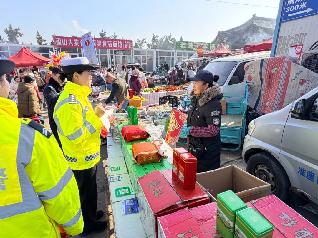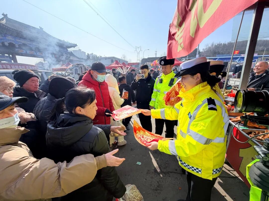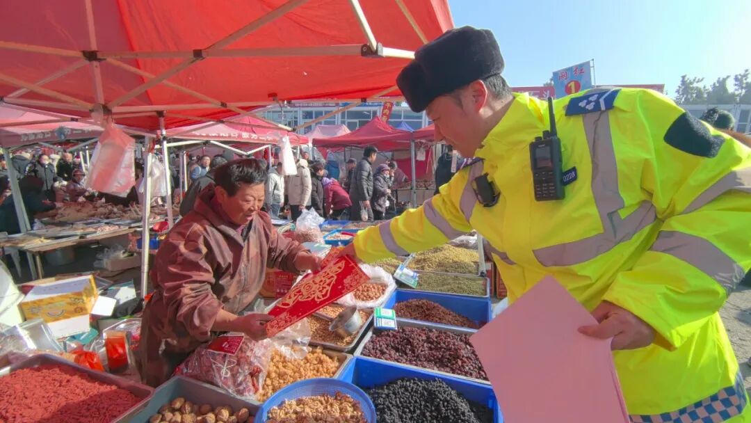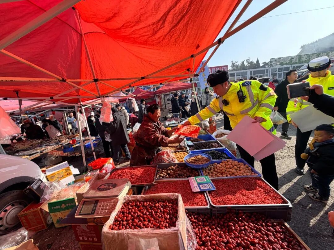 大集之上年味氤氲、人头攒动,民警在人流密集的摊位周边,以发放宣传材料、现场答疑讲解等形式,向过往赶集群众普及交通安全常识。