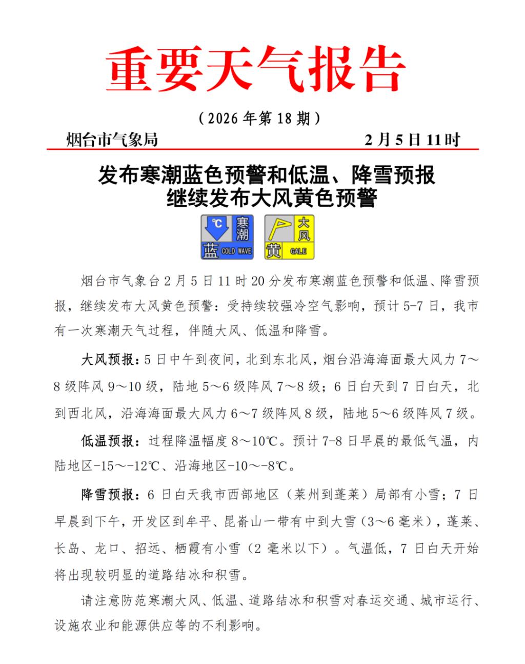 6日白天我市西部地区(莱州到蓬莱)局部有小雪;7日早晨到下午,开发区到牟平、昆嵛山一带有中到大雪(3~6毫米),蓬莱、长岛、龙口、招远、栖霞有小雪(2毫米以下)。气温低,7日白天开始将出现较明显的道路结冰和积雪。