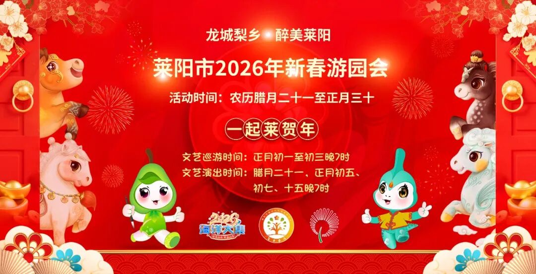 金蟒腾云辞旧岁,骏马踏雪报新春!2月8日(腊月二十一),“龙城梨乡·醉美莱阳”莱阳市2026年新春游园会将在市五龙广场和蚬河公园元宝湖沿岸正式启幕!