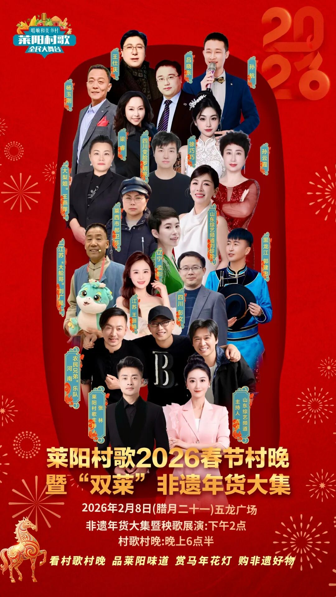 下午2点,逛非遗年货大集、看秧歌展演、品莱阳味道、购非遗好物……晚上6点半,看村歌村晚、赏马年花灯……