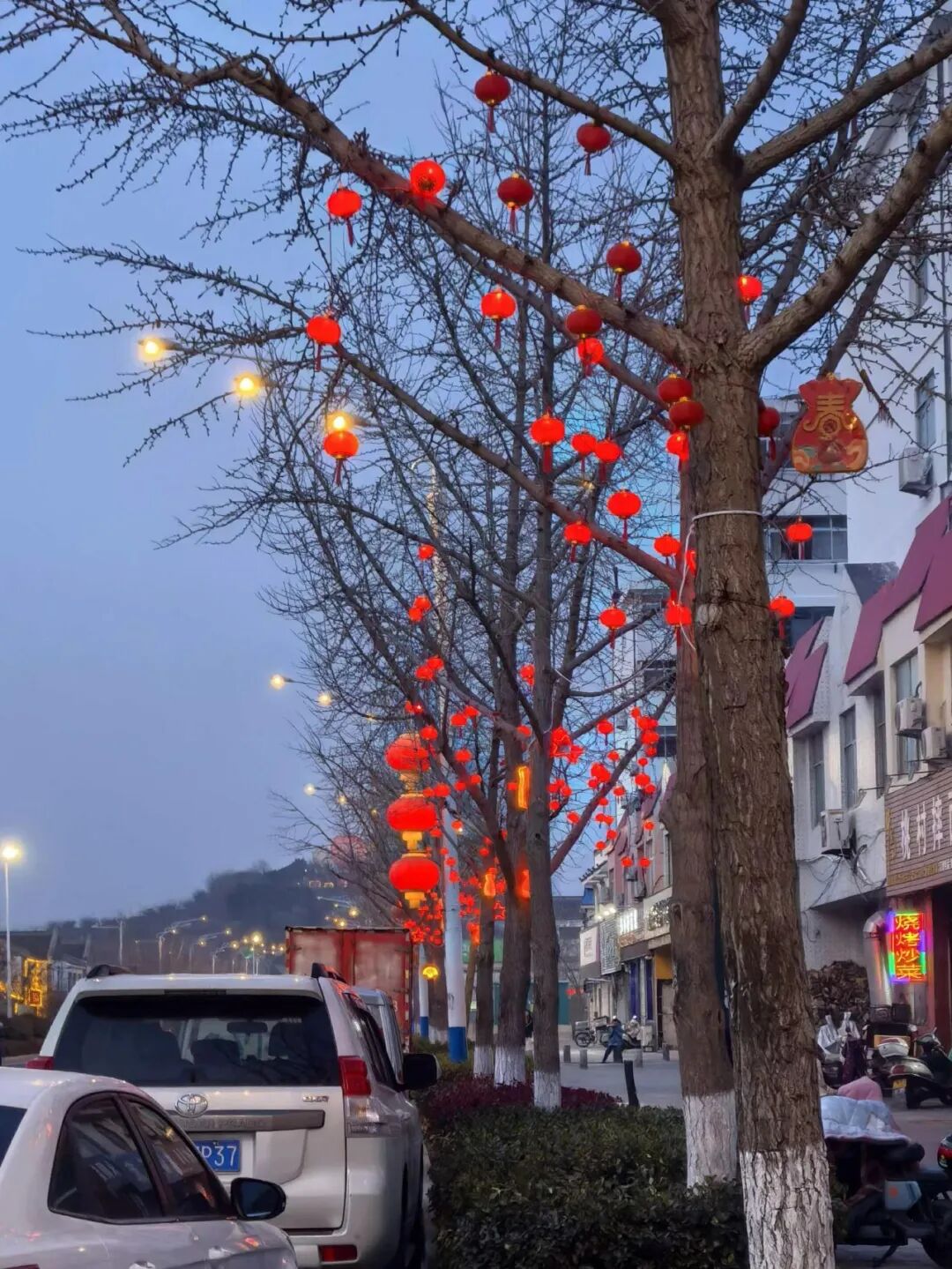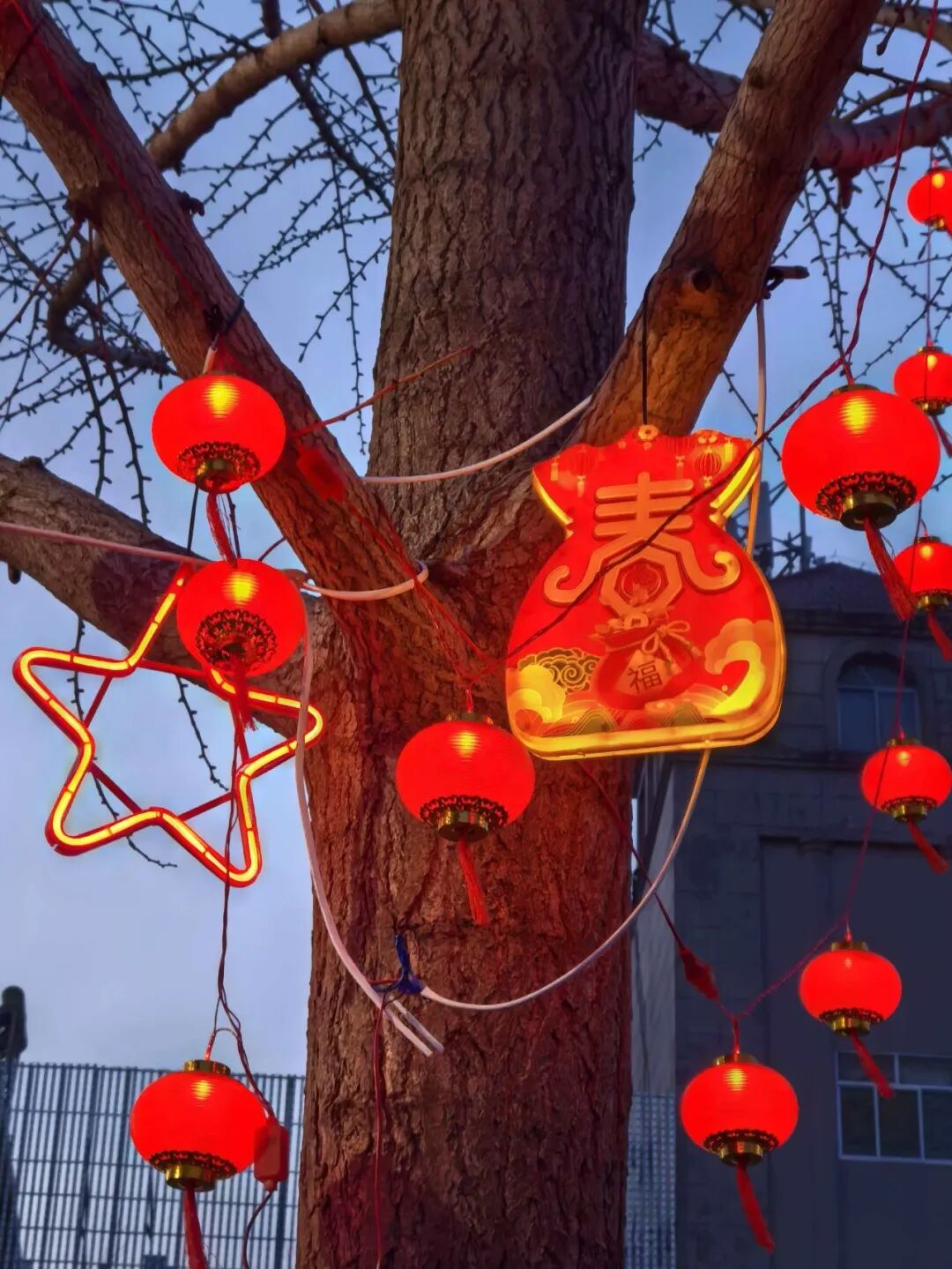 一盏盏彩灯陆续就位,年味也顺着城市街道缓缓铺展开来。今年,新增多种特色造型彩灯,与传统串灯错落搭配。华灯初上,点点光影唤醒城市,串串红灯笼绵延如红霞漫卷,吉庆中国结悬于枝头熠熠生辉,雅致国风扇面晕染东方韵味,闪亮五角星点缀其间,并有月亮、福袋、小型螺纹灯笼装点枝头、交织摇曳,一步一景皆是浪漫、祥和的新年韵味。