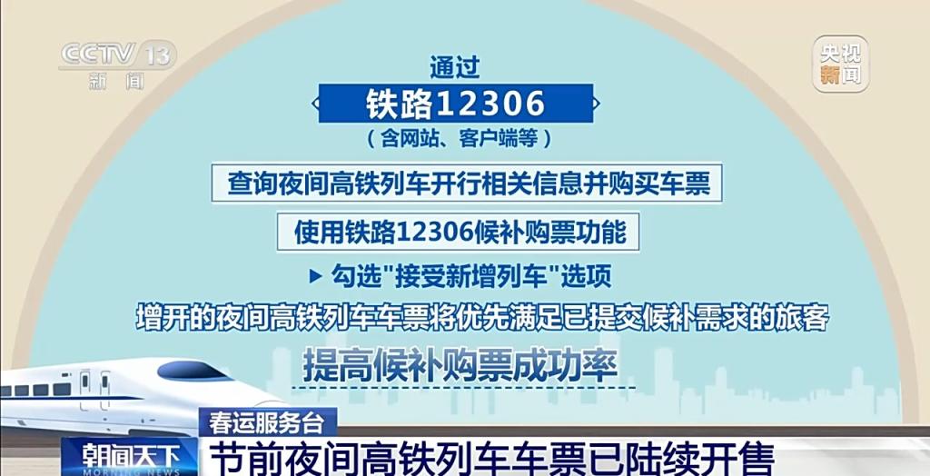 旅客朋友可以通过铁路12306(含网站、客户端等)查询夜间高铁列车开行相关信息并购买车票,也可使用铁路12306候补购票功能,勾选“接受新增列车”选项,增开的夜间高铁列车车票将优先满足已提交候补需求的旅客,提高候补购票成功率。