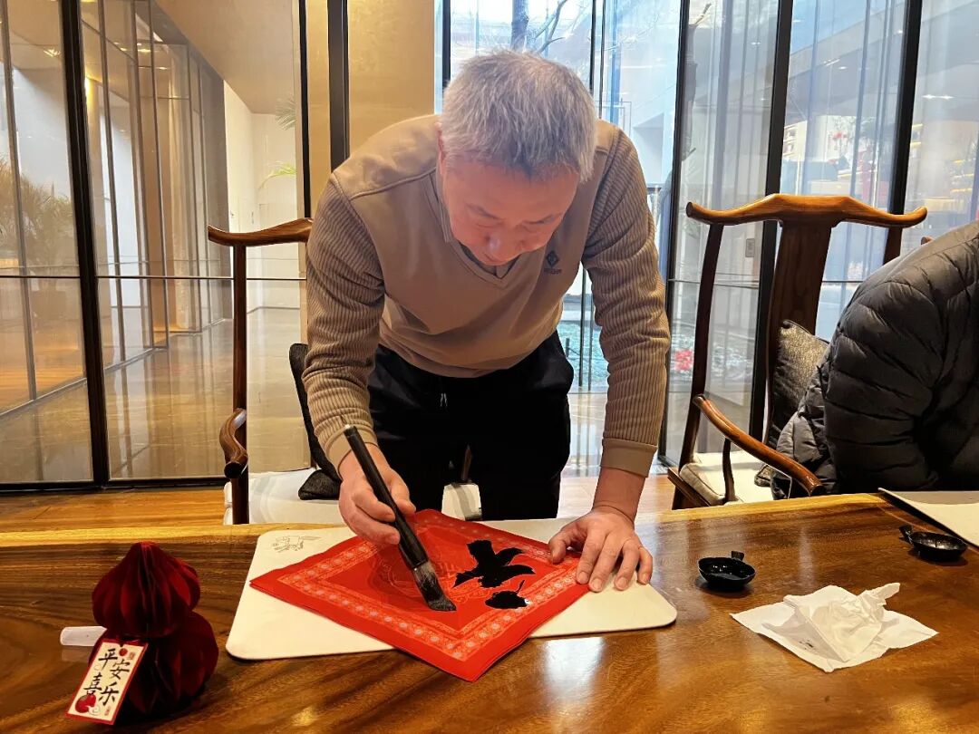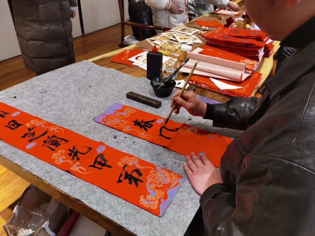 长桌一侧,墨汁在砚中轻漾。书法家悬腕运笔,笔锋游走间,墨迹未干,福气已至。一个个“福”字饱满丰润,一副副春联气韵生动,每一笔都带着呼吸的韵律。“写春联啊,要心静气沉,墨要饱,意要诚。”初学者用手指轻拢住笔杆,写下虽稚拙却格外真诚的一横一竖。