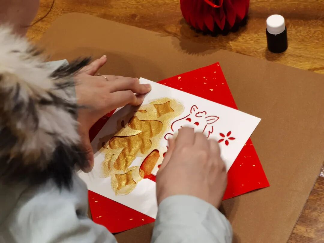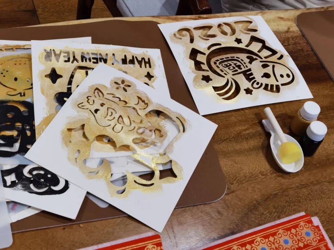 旁边拓印区,孩子们用拓包蘸着颜料轻轻拍在雕版上,闪着金光的颜料均匀地铺满小马的轮廓。揭起的瞬间——一匹金色的小马跃然纸上,孩子小心翼翼地拿起红纸,仿佛要护送这匹小马奔进新年。