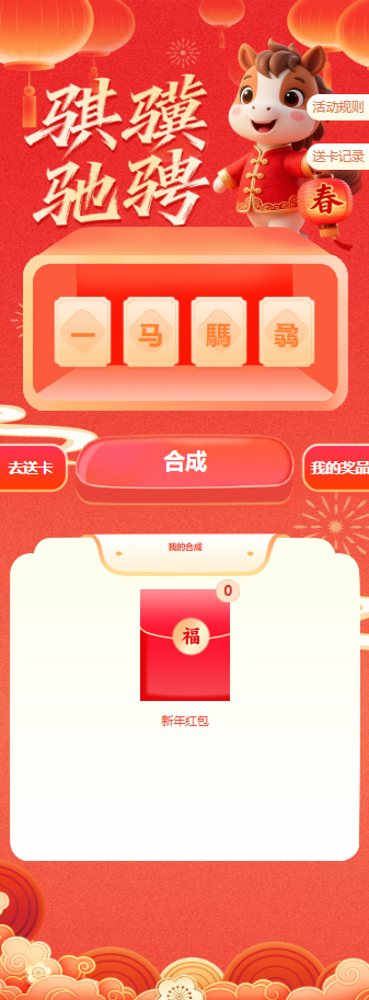 3、在活动期间内,每个用户每天有5次免费抽卡的机会,集齐“一”“马”“騳”“骉”四张卡牌后可合成一个福袋,合卡成功一次后可免费参与一次抽奖活动,100%获得现金红包奖励,奖励金额随机;
