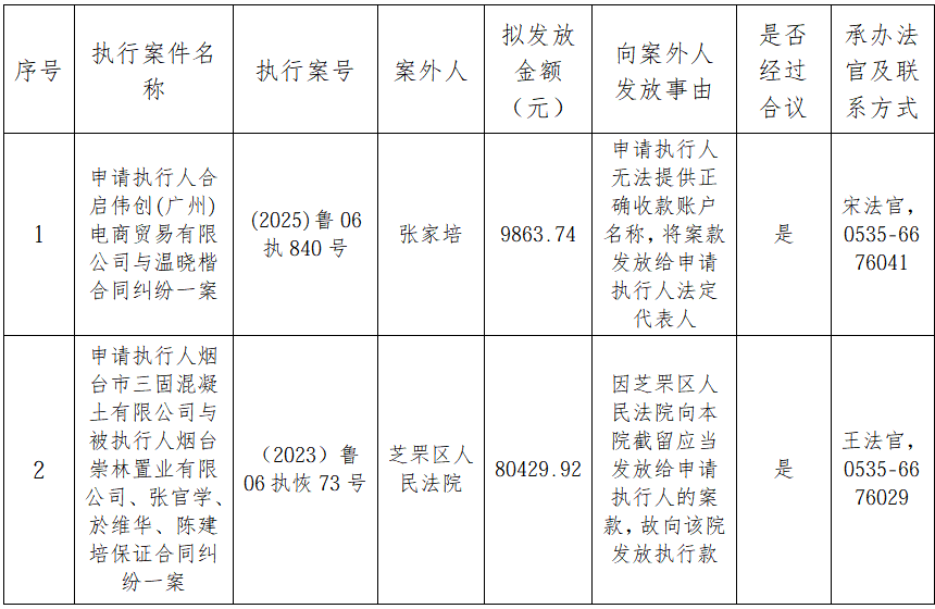 为进一步严格执行案款管理,规范执行案款发放程序,确保执行案款发放安全,根据最高人民法院《关于执行款物管理工作的规定》等相关规定要求,现对以下执行案款发放事宜进行公示,公示期为三个工作日(2026年2月10日-2月12日),案件当事人或者其他利害关系人如有异议应当在公示期内提出并提交相关证据材料,公示期满无异议的,本院将按照执行案款管理的相关规定办理发放手续。