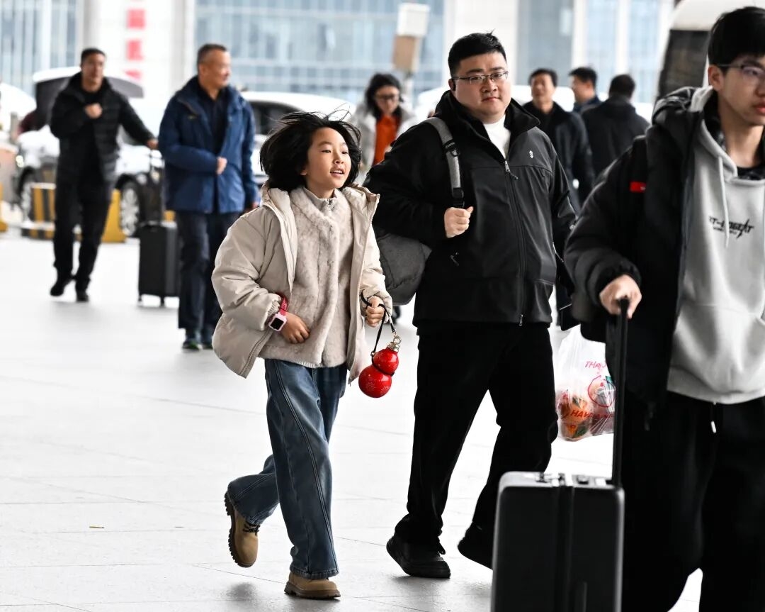 2月6日,在南京南站,小朋友跟随家人准备进站乘车。新华社记者 季春鹏 摄