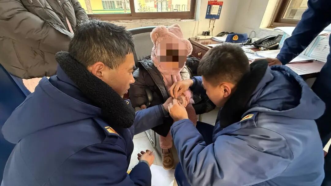 2月4日,莱阳市一名家长带着孩子到消防站寻求帮助,4岁女童因贪玩将手指插进铁片孔洞被卡。