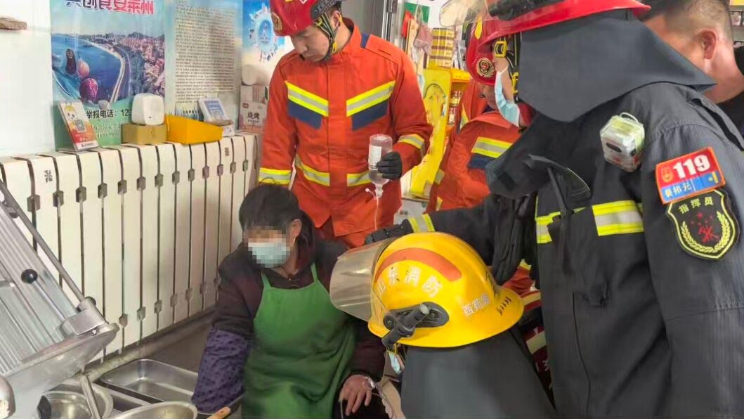 在确保绞肉机断电且现场无漏电风险后,消防员使用角磨机对绞肉机外壳进行切割,并使用液压扩张器,对内部刀具组件进行扩张。经过1个小时的处置,被困人员成功脱险。