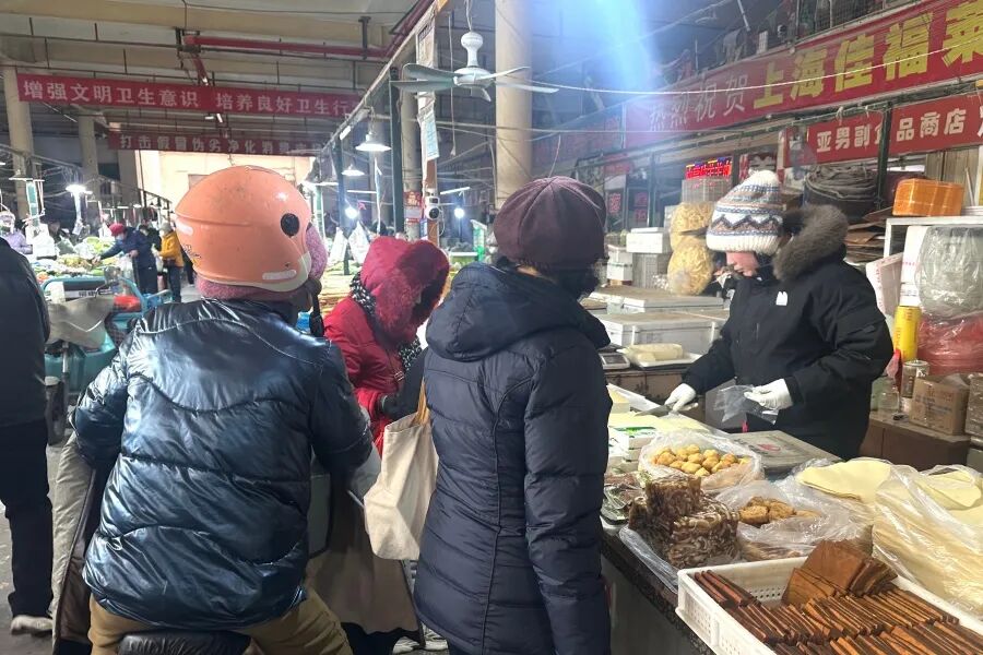 论起最地道的年味儿,终究藏在烟火气十足的农贸市场里。寒意挡不住人们备年货的热情,长岛的农贸市场早已热闹起来,灌肠、酱肉、干货、新鲜蔬果等特色年货纷纷亮相,成为摊位上的“主角”。
