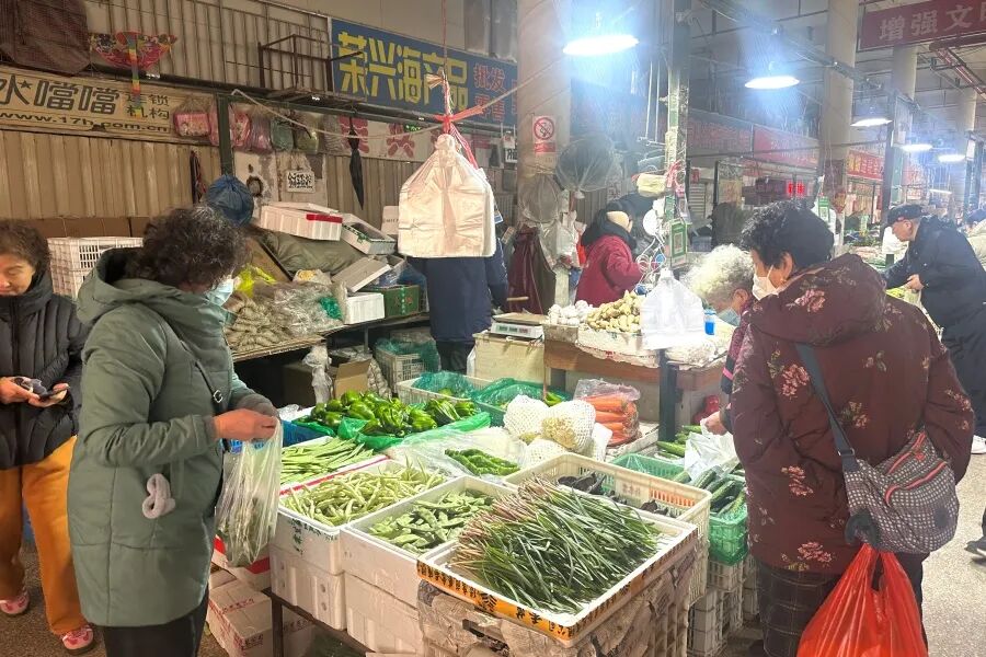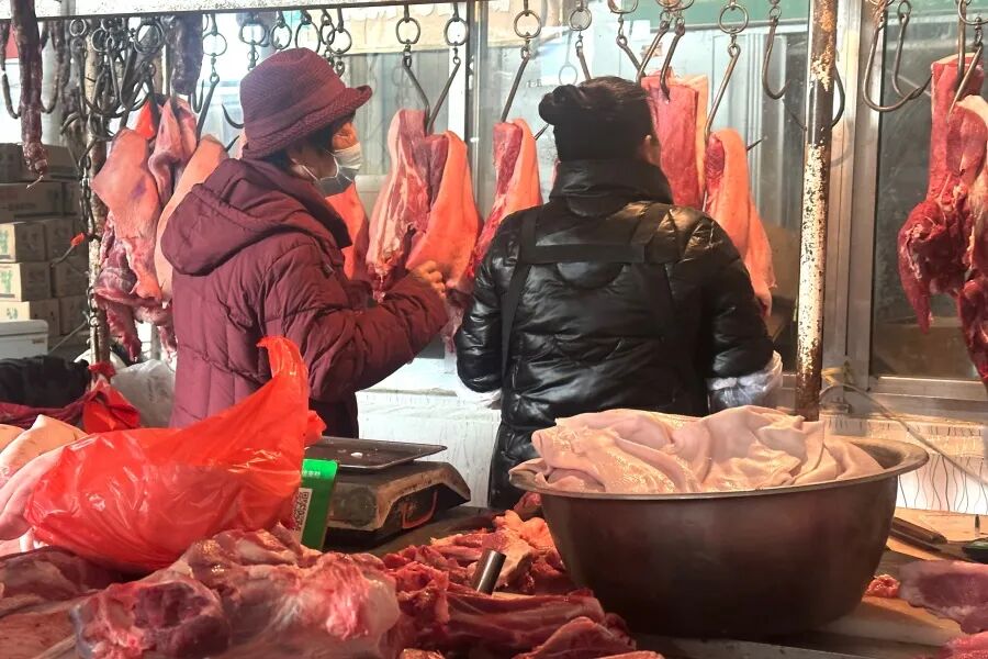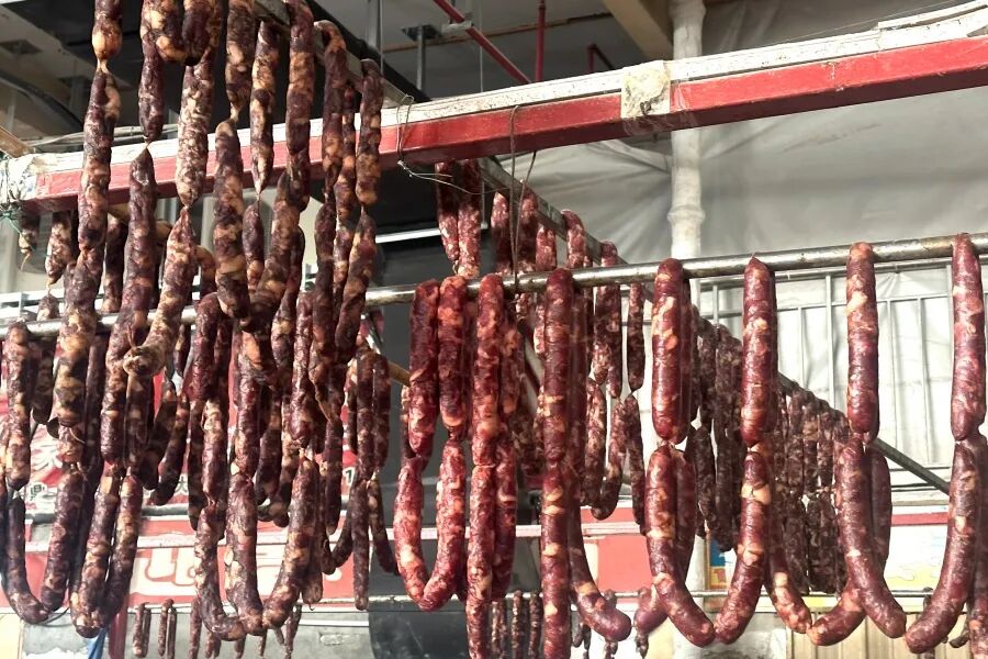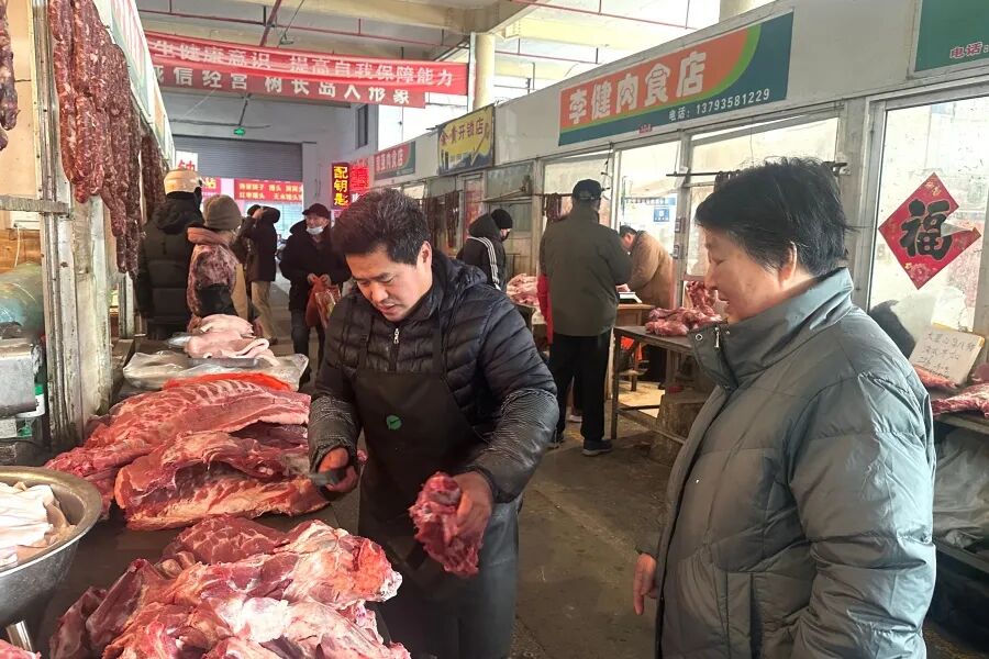 对于老百姓来说,过年的仪式感,离不开一串鲜香入味的灌肠、一块色泽鲜亮的酱肉。走进农贸市场,肉类摊位前人气最旺,摊主们忙得不亦乐乎,一边招呼顾客,一边加快手中的活儿,“进入腊月就开始忙了,每天都能卖出不少,都是老顾客照顾,忙点也开心。”