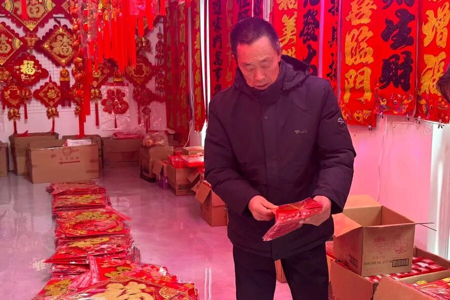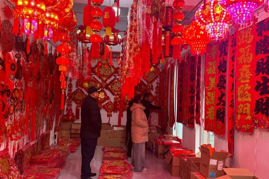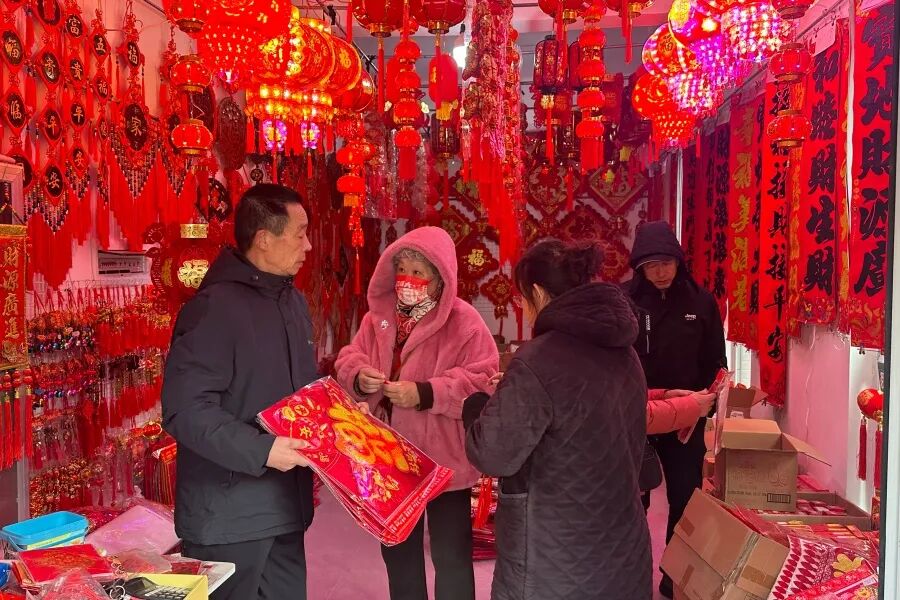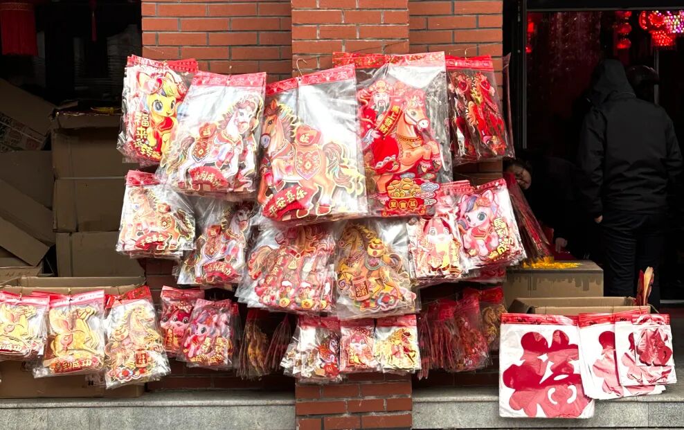 年味儿渐浓,饰品添喜。除了吃喝用度外,年节饰品也是年货采购的重要组成部分。走进步行街,火红的灯笼挂满枝头,各式福字、春联、窗花整齐摆放,带有马年元素的挂件、贴纸、灯笼等饰品琳琅满目,色彩鲜艳、寓意美好,吸引了不少居民驻足选购。