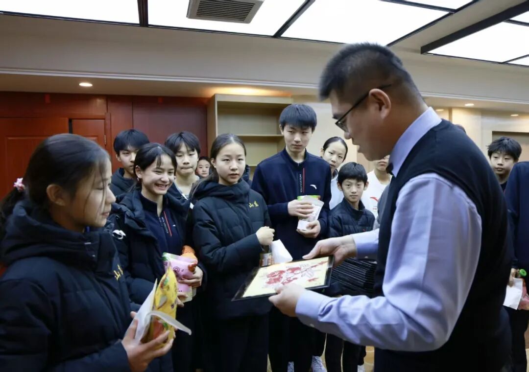 慰问团队专程前往,将一批贴有定制冬奥元素的“艺术苹果”、苹果深加工产品以及富有胶东韵味的冬奥主题剪纸作品送到运动员手中。这份心意不仅承载着我市人民对体育健儿的深情祝福,也展现了我市特色产业主动融入体育事业、助力家乡运动队伍发展的积极姿态。