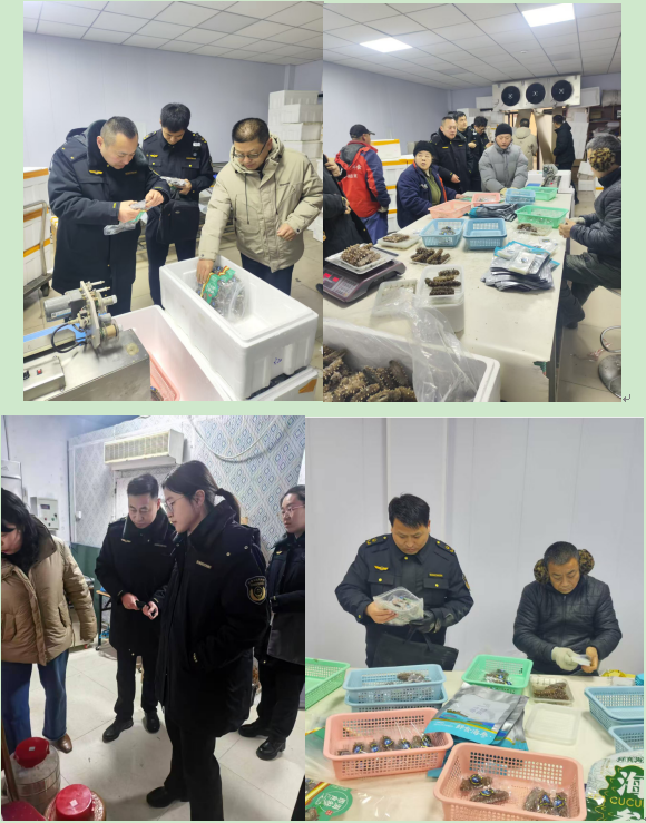 在流通环节,一是深入莱山区院格庄、盛泉、初家等农村大集,重点查看大集内食品摊点是否办理摊点备案证,肉类销售摊点是否留存“两证”(动物产品检疫合格证、肉品品质检验合格证),预包装和散装食品销售摊点是否索证索票等;二是市、区两级联动开展海参制品专项执法行动,出动80余名执法人员对芝罘区中正干海产品市场、汇通海产品糖酒茶市场、中汇农贸市场内的海参制品生产经营单位开展全面检查,立案查处5家无证生产加工单位,查扣问题海参制品600余斤,有力震慑了违法行为。