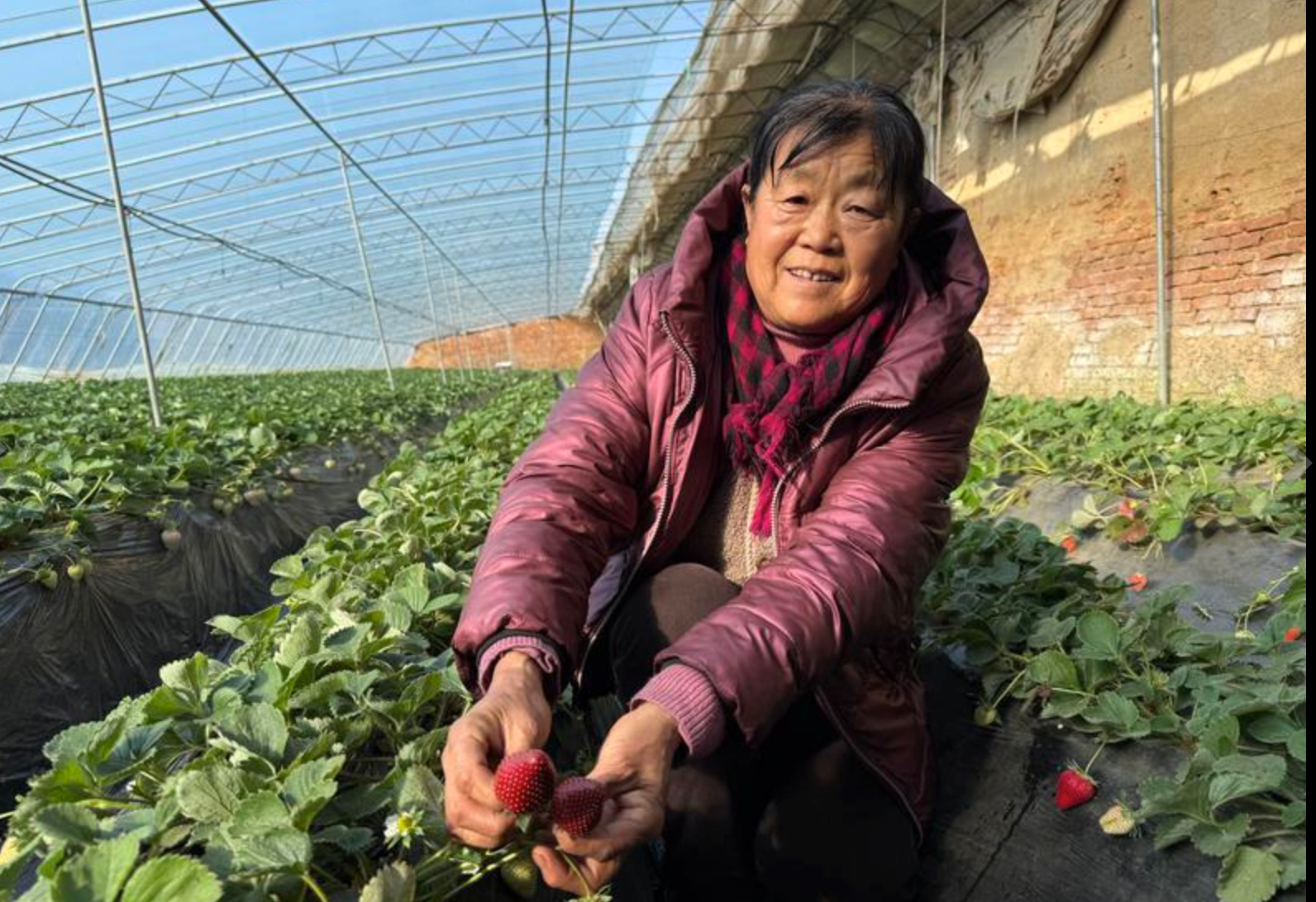 说话间,一位40多岁模样的村民从外面走来。“俺儿送货回来了,让他给你们详细讲讲吧。”聊天功夫,老妈妈手里的小筐装满了又大又红的冰糖心草莓!