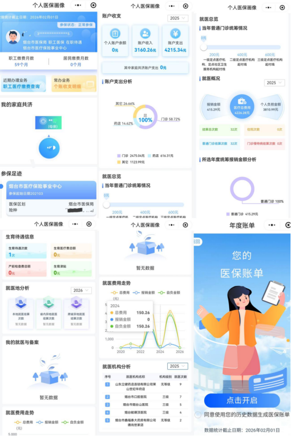 作为山东省“个人医保云”建设的重要实践,烟台市依托省“两数”体系,以数据融合驱动服务升级,以群众需求和业务导向指引服务方向,聚焦高频关切,细化查询指标,创新推出“个人医保画像”服务。通过对医保数据的深度整合和智能重构,将分散在医院、药店、经办窗口等多渠道的碎片化信息,汇聚成一份专属、动态、可视化的个人医保全景图,真正让群众“看得清、算得明、用得准”。