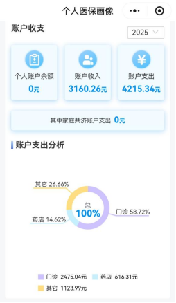 个人账户余额实时更新,账户支出自动划分为住院、门诊、慢病和药店购药4类开展统计分析,消费结构、占比分布直观展示,家庭共济账户支出可追溯、可查询,账户资金流向清清楚楚。