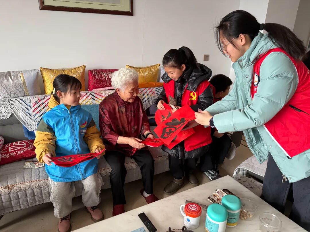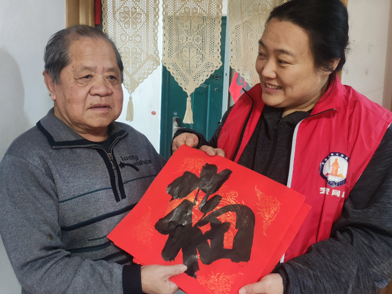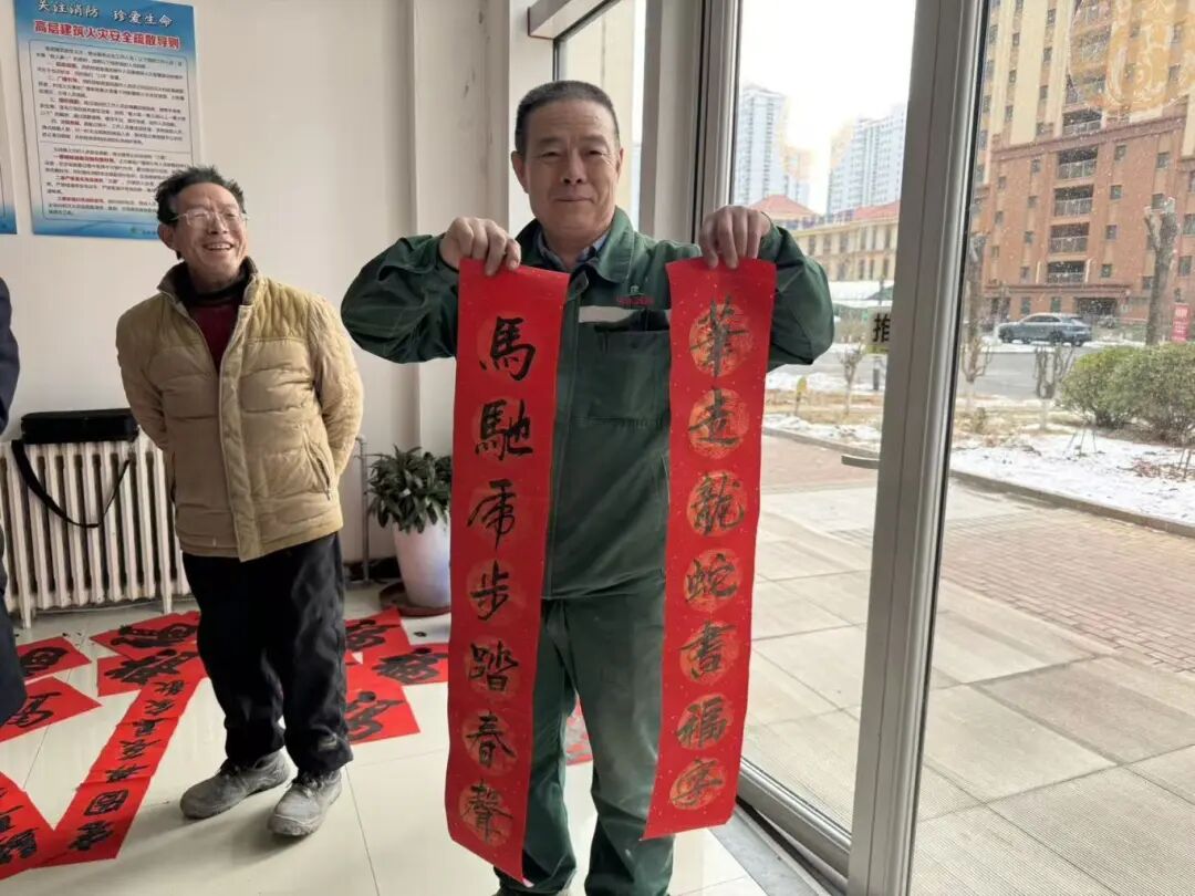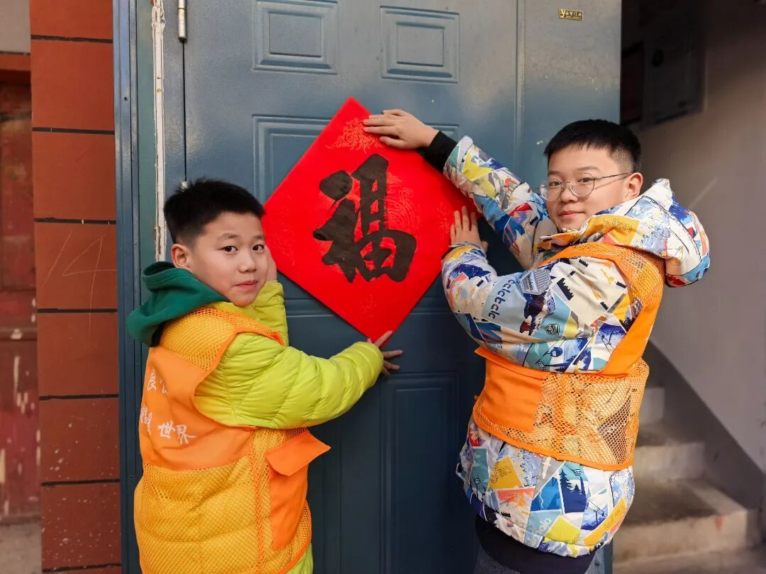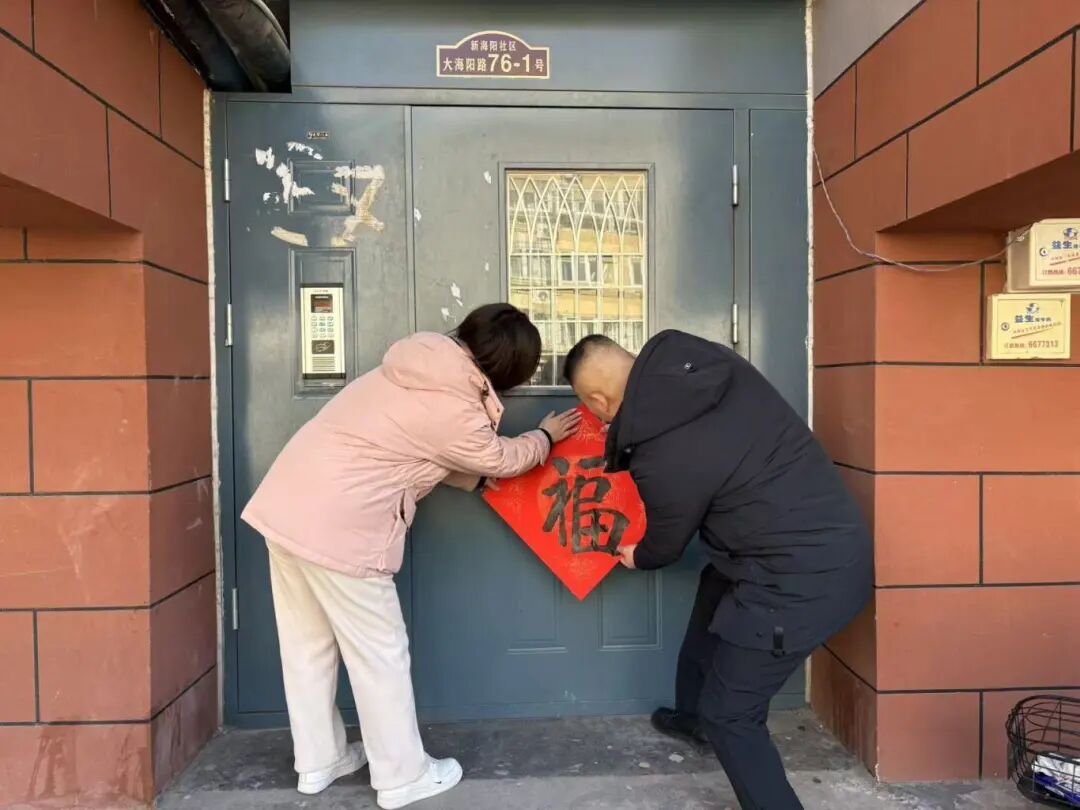 送福途中,志愿者们还不忘向坚守岗位的小区保洁员送上关怀与祝福。看到正在清扫小区道路的新海阳社区保洁员辛大叔,孩子们连忙递上福字和春联,轻声说道:“爷爷,打扫卫生辛苦了,祝您新的一年开心、健康!”辛大叔接过福字,开心地竖起了大拇指,为孩子们的暖心举动点赞,也为这份冬日里的温暖动容。与此同时,社区网格员与双报到单位志愿者们分工协作,逐一为辖区单元楼门张贴福字、悬挂春联,红彤彤的福字点缀着单元门,鲜艳的春联映衬着街巷,不仅扮靓了社区环境,更将新春的吉祥与美好传递到每一户居民心中,让整个社区都沉浸在喜庆祥和、文明有序的新春氛围里。
