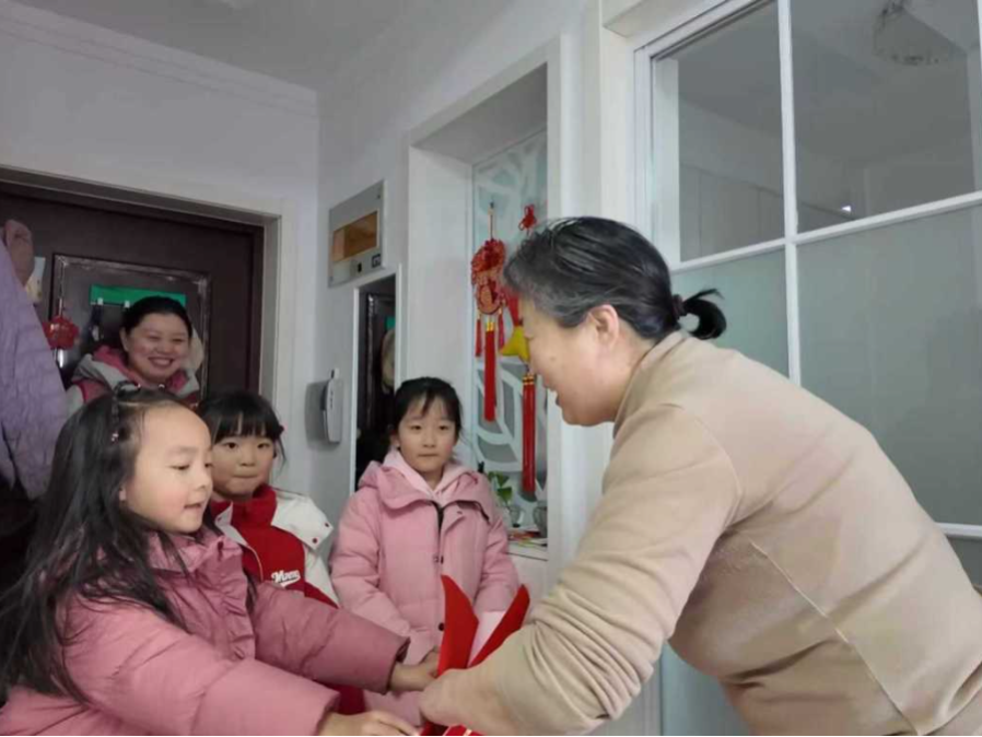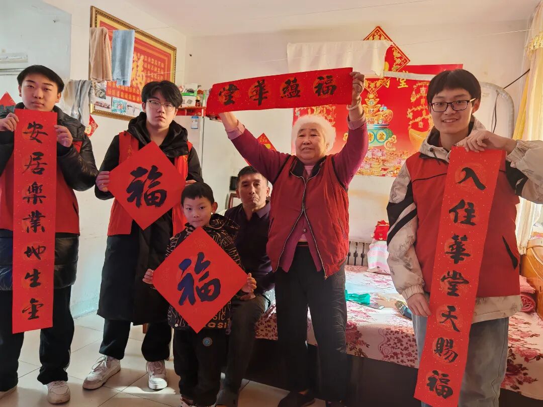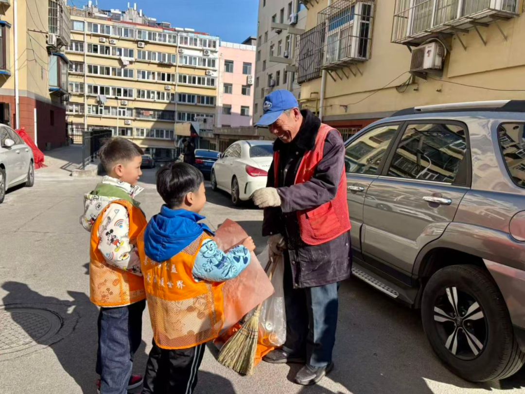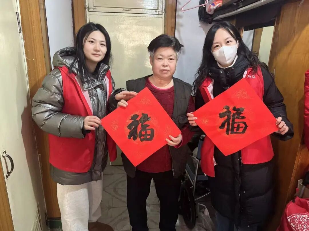 送福途中,志愿者们还不忘向坚守岗位的小区保洁员送上关怀与祝福。看到正在清扫小区道路的新海阳社区保洁员辛大叔,孩子们连忙递上福字和春联,轻声说道:“爷爷,打扫卫生辛苦了,祝您新的一年开心、健康!”辛大叔接过福字,开心地竖起了大拇指,为孩子们的暖心举动点赞,也为这份冬日里的温暖动容。与此同时,社区网格员与双报到单位志愿者们分工协作,逐一为辖区单元楼门张贴福字、悬挂春联,红彤彤的福字点缀着单元门,鲜艳的春联映衬着街巷,不仅扮靓了社区环境,更将新春的吉祥与美好传递到每一户居民心中,让整个社区都沉浸在喜庆祥和、文明有序的新春氛围里。