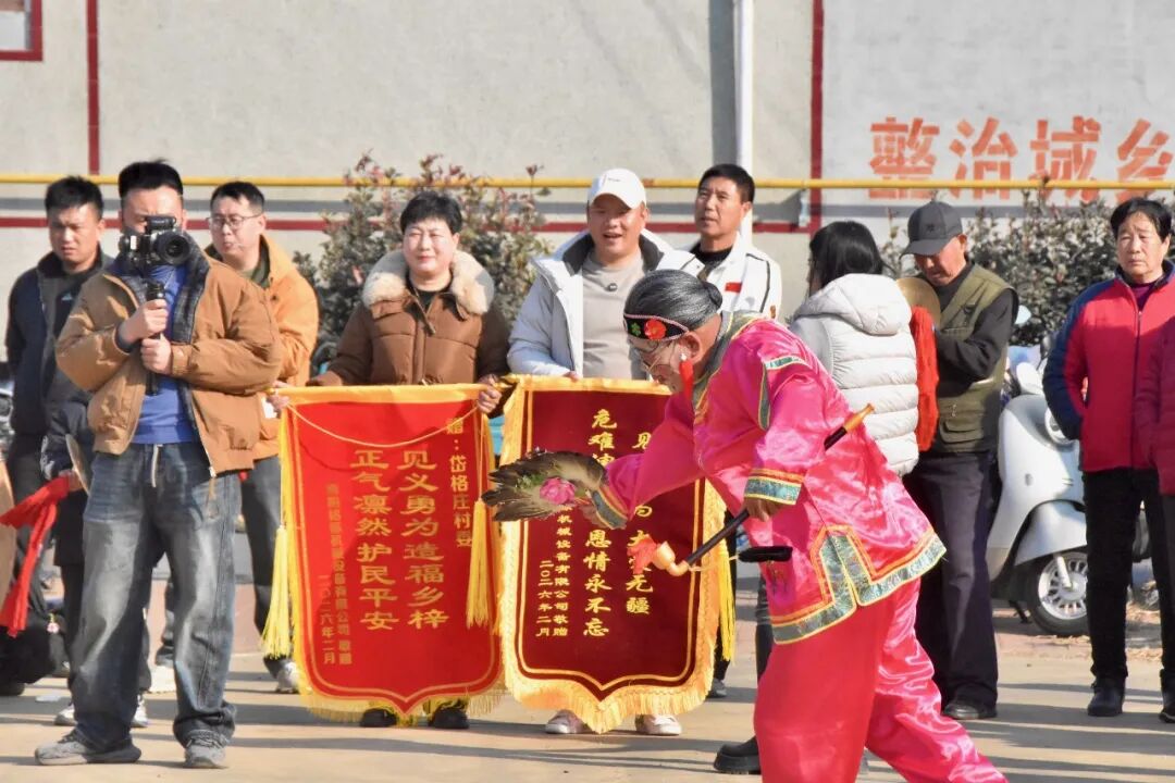 “见义勇为 危难伸援手 大爱无疆 恩情永不忘”的锦旗赠予姜琨本人,“见义勇为造福乡梓 正气凛然护民平安”的锦旗则送至岱格庄村委,共同感谢姜琨在危难关头挺身而出、勇救起火车辆中3名人员的英勇事迹。