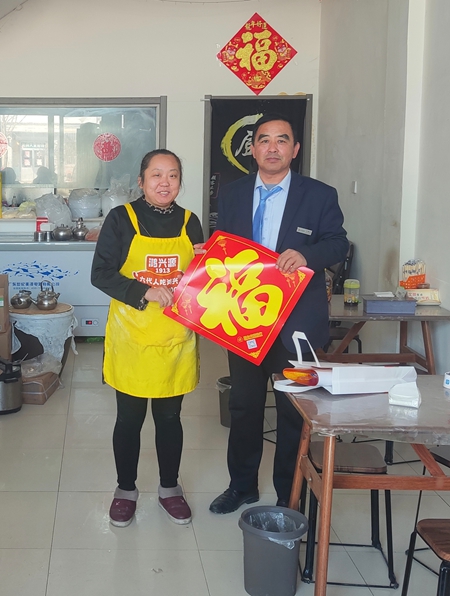 烟台融媒2月12日讯(通讯员 林正旭 赵灿灿)年味渐浓,福暖人间,红彤彤的灯笼缀满街巷,喜庆的年味在烟火气中悄然升腾。近日,烟台农商银行牟平区观水支行党支部组织开展“新春送福进商户”走访活动,将红彤彤的春联、金灿灿的福字和诚挚的节日问候,逐一送到辖区沿街商户手中,让商户们在寒冬里感受到浓浓的暖意与年味。