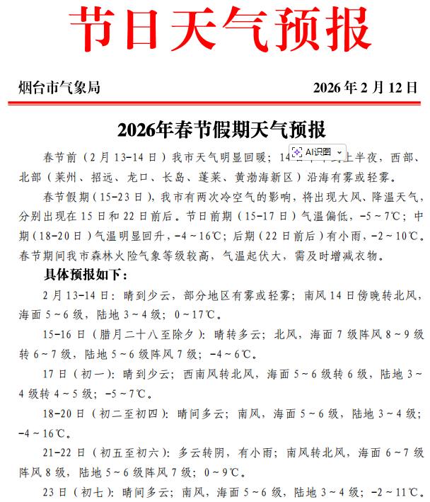 春节前(2月13-14日)我市天气明显回暖;14日下午到上半夜,西部、北部(莱州、招远、龙口、长岛、蓬莱、黄渤海新区)沿海有雾或轻雾。春节假期(15-23日),我市有两次冷空气的影响,将出现大风、降温天气,分别出现在15日和22日前后。节日前期(15-17日)气温偏低,-5~7℃;中期(18-20日)气温明显回升,-4~16℃;后期(22日前后)有小雨,-2~10℃。春节期间我市森林火险气象等级较高,气温起伏大,需及时增减衣物。