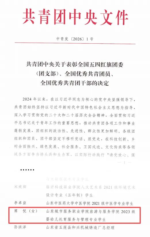 近日,共青团中央发布了《关于表彰全国五四红旗团委(团支部)、全国优秀共青团员、全国优秀共青团干部的决定》,山东城市服务职业学院2023级婴幼儿托育服务与管理专业学生席悦被授予“全国优秀共青团员”称号。