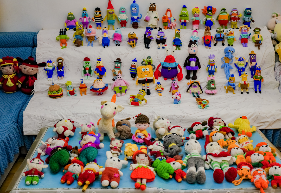 2019年退休在家的马洪梅因女儿无意中带回的一个玩偶,便开始对其产生兴趣。“年轻时有钩花的经验,同时我也在手工艺品厂工作过,两者经验相结合,加之网上有不少教程视频,于是就尝试开始钩。”最开始马洪梅仅是钩织一些简单的玩偶,一边钩一边学一边总结经验,在多番尝试下,越来越多有“难度”的玩偶也从她手中被钩出来,大大增加了其信心。“现在有许多没有教程的玩偶,凭借积攒的经验,也能完整钩出来。”