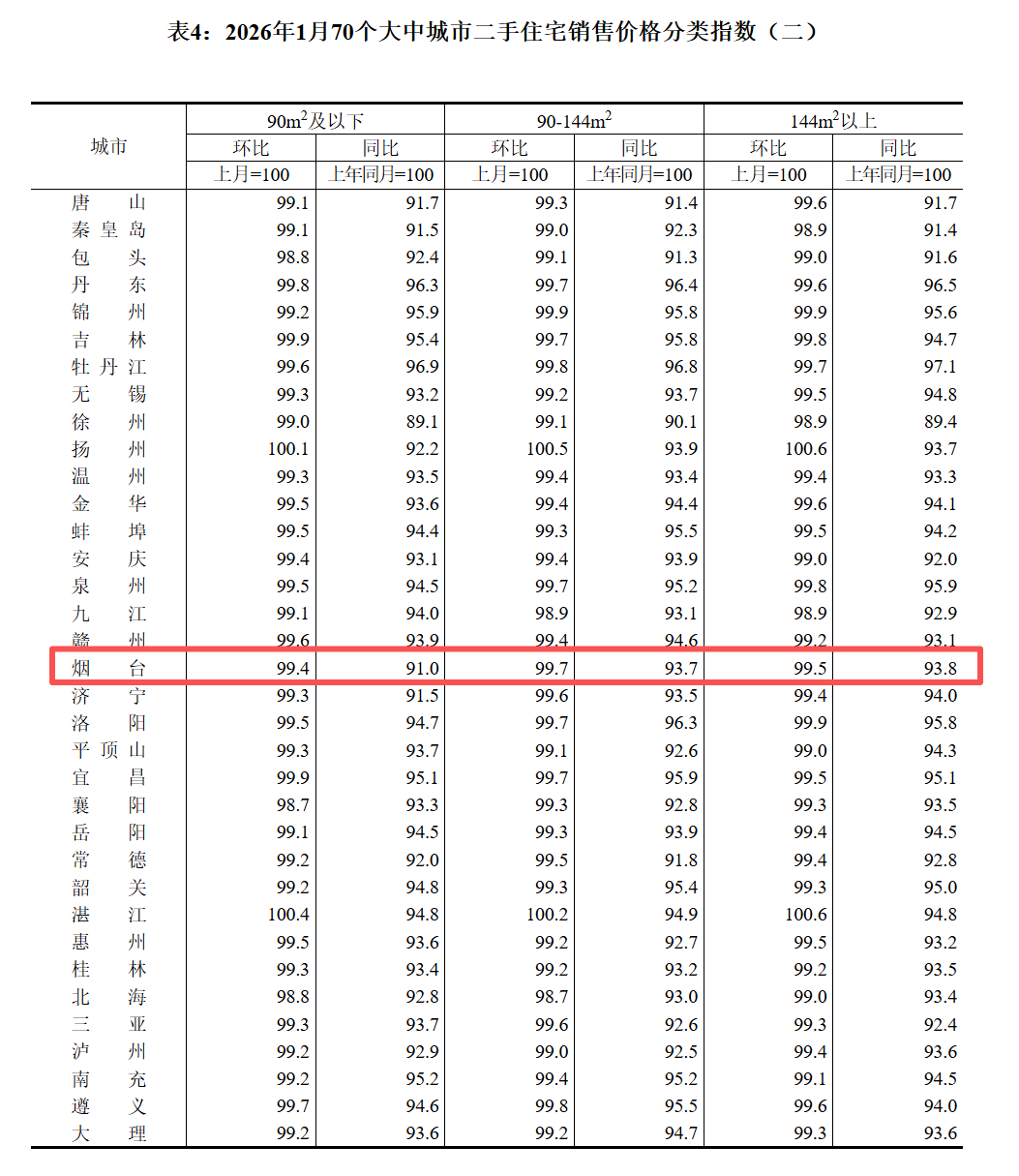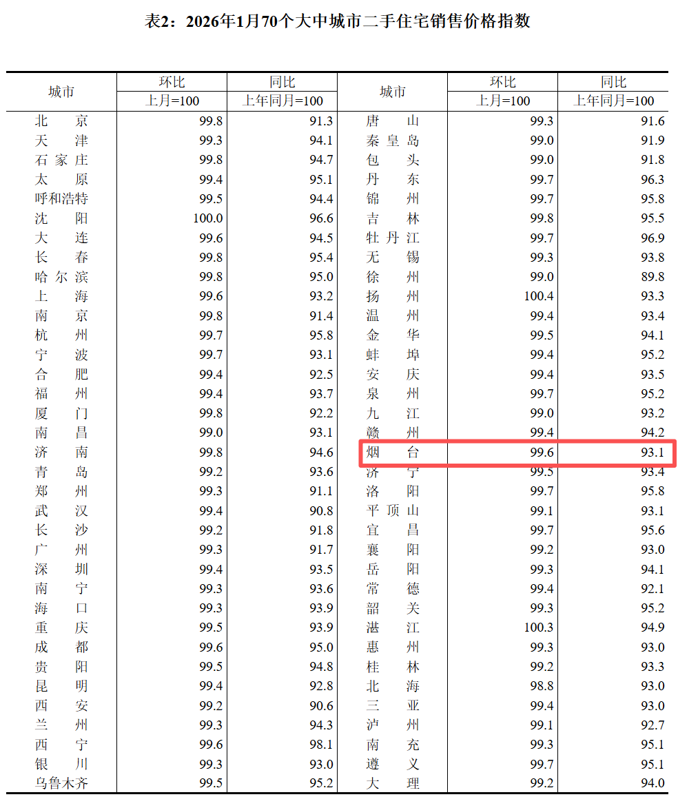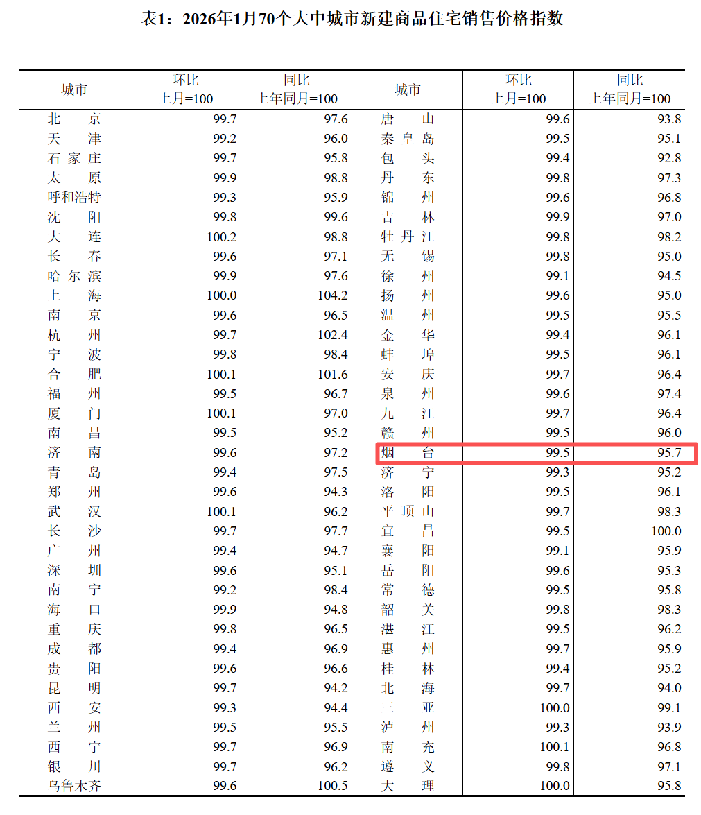 烟台融媒2月13日讯(记者 杨健)今天上午,国家统计局发布了2026年1月份70个大中城市商品住宅销售价格变动情况。1月份,烟台新房环比2025年12月下降0.5%,同比2025年1月份下降4.3%;二手房方面,烟台二手房环比2025年12月下降0.4%,同比2025年1月下降6.9%。