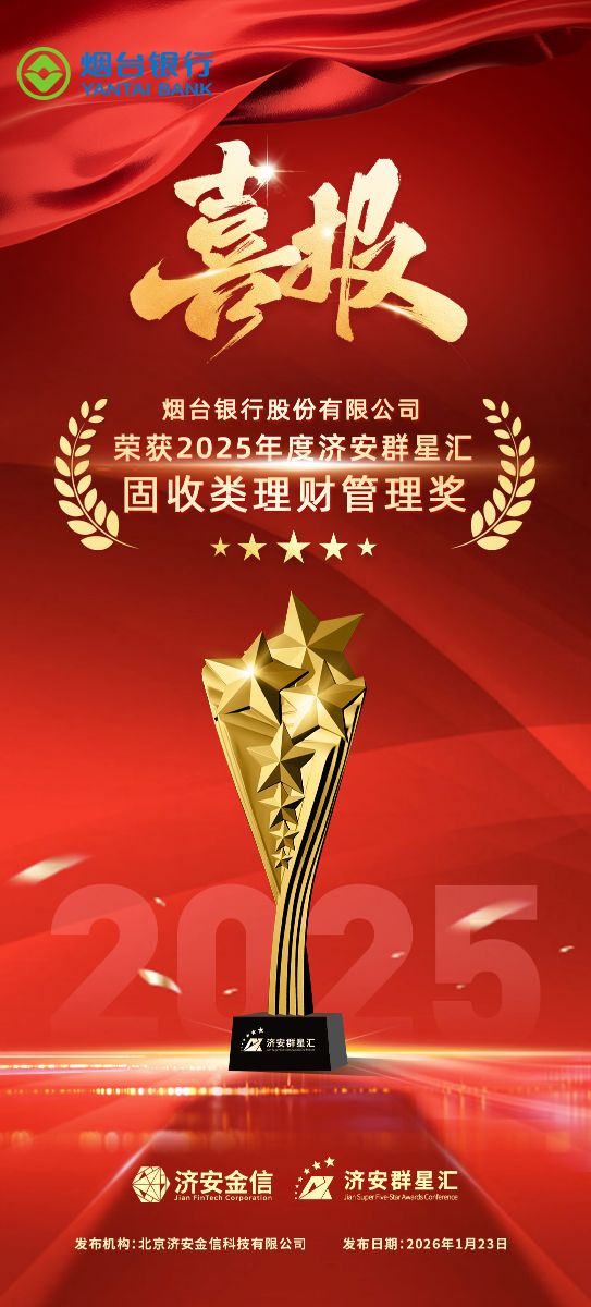 烟台融媒2月23日讯(通讯员 李璟)1月23日,备受行业关注的“中国资管群星汇颁奖典礼暨私募基金高质量发展论坛”在北京举行。烟台银行凭借在固定收益类理财产品领域的稳健运作与卓越业绩,荣获“2025年度济安群星汇固收类理财管理奖”。