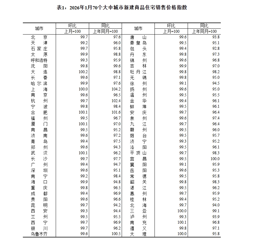 表1:2026年1月70个大中城市新建商品住宅销售价格指数