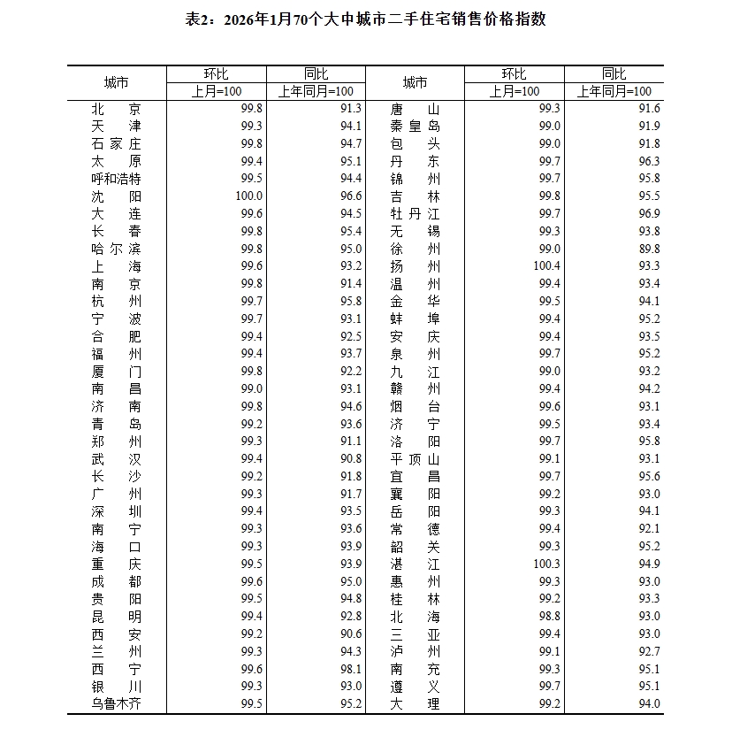 表2:2026年1月70个大中城市二手住宅销售价格指数