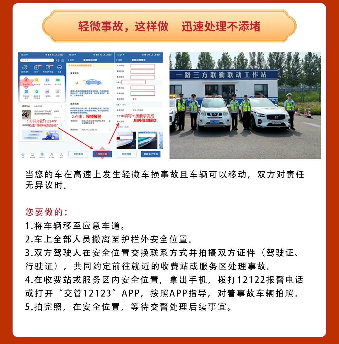 3. 及时拨打报警求助电话:高速报警12122、急救120,或扫描高速护栏上的“路网服务一键通”二维码扫码求助(辖区全路段应急车道护栏板间隔50米布设寻址定位二维码),也可直接拨打山东高速24小时服务热线96659求助,告知接线人员具体位置(高速名称、行驶方向、桩号)及现场情况,工作人员将第一时间调派救援力量。