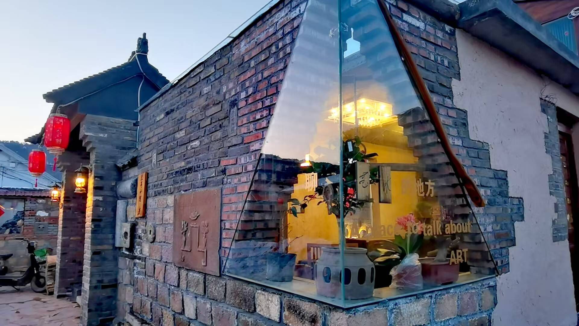 看似随意摆放的酒吧柜,灯架、博古架……都是柳榴在村子里淘来再稍加改造的,周边摆做的小手工艺品,游客们围坐在磨盘椅上,古朴慵懒的氛围中又透出一丝活力和俏皮。