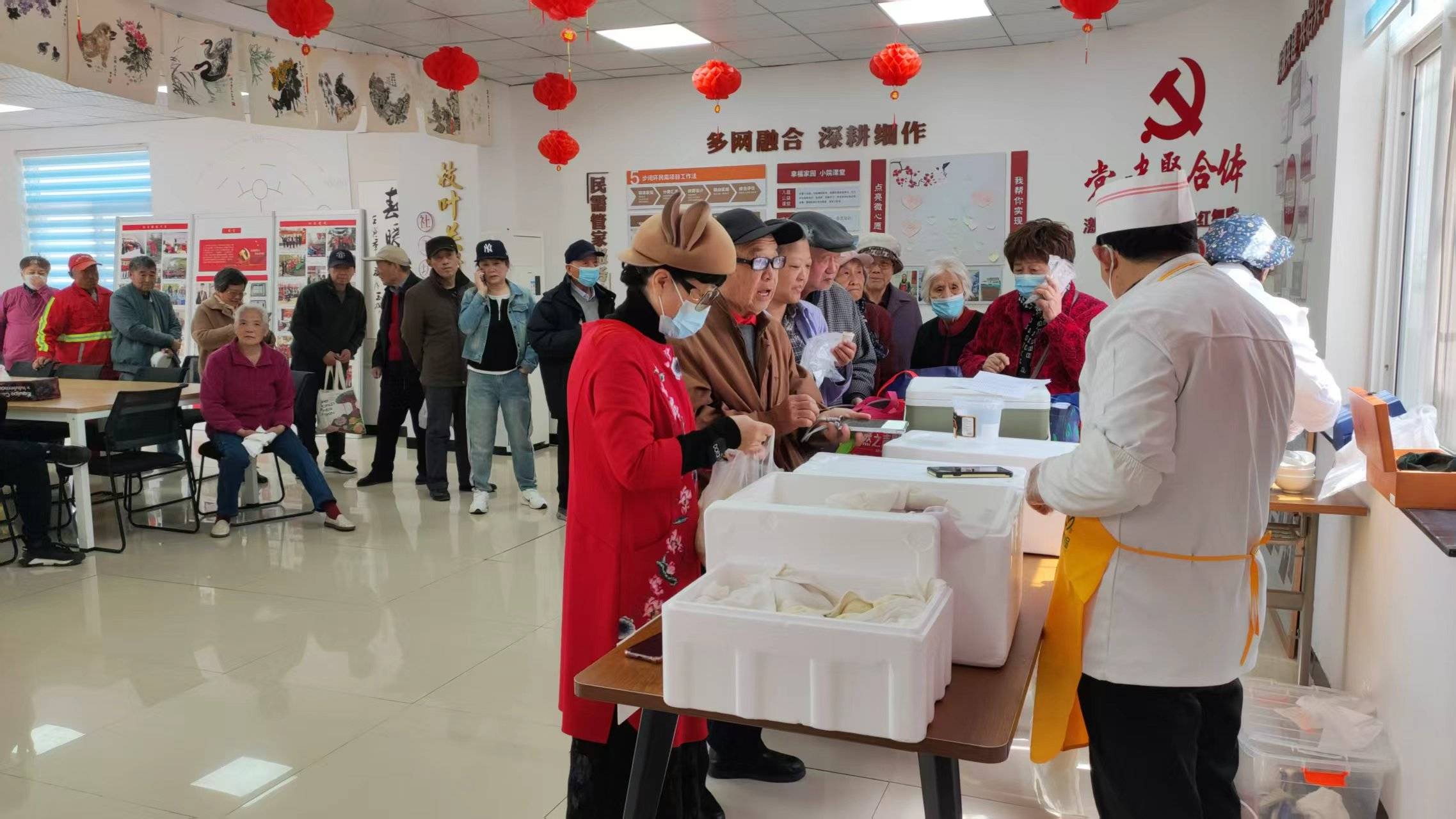 几位老人陆续走进社区活动室旁的小厅,从穿着红马甲的志愿者手中接过热腾腾的饭菜。餐盒内,两荤一素,有饭有汤,热气腾腾。这样的一顿营养午餐,老人只需要支付两元钱。