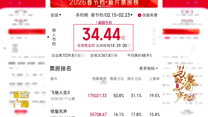 根据猫眼专业版APP数据,截至今天14:30,全国春节档票房已达34.44亿元。