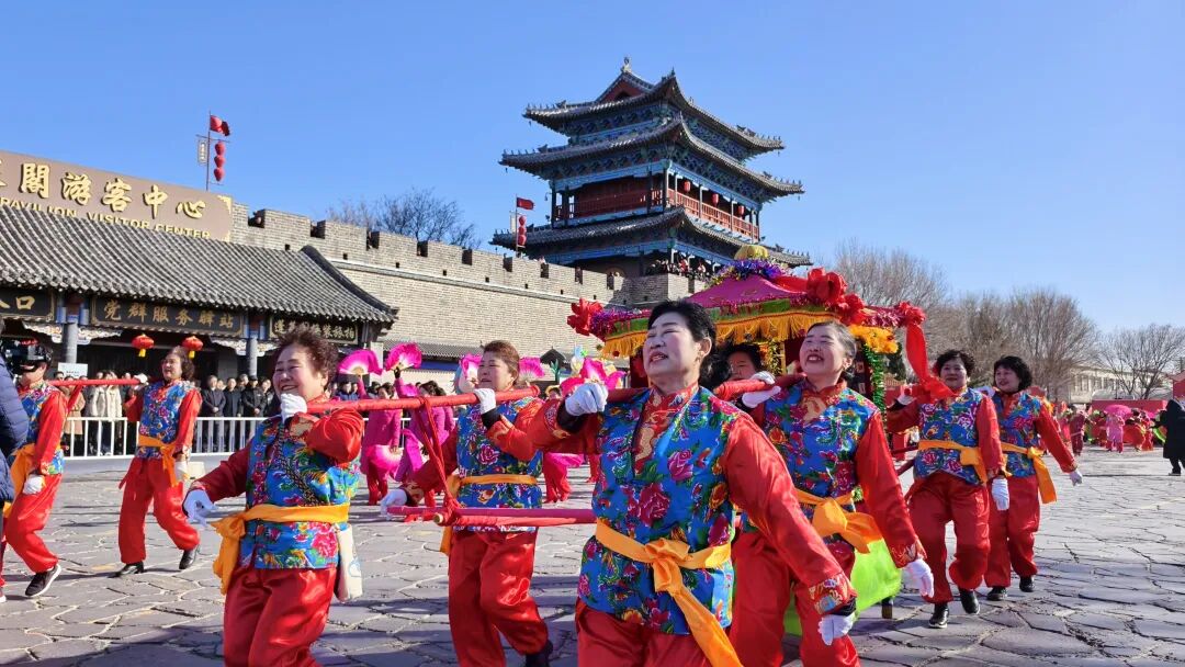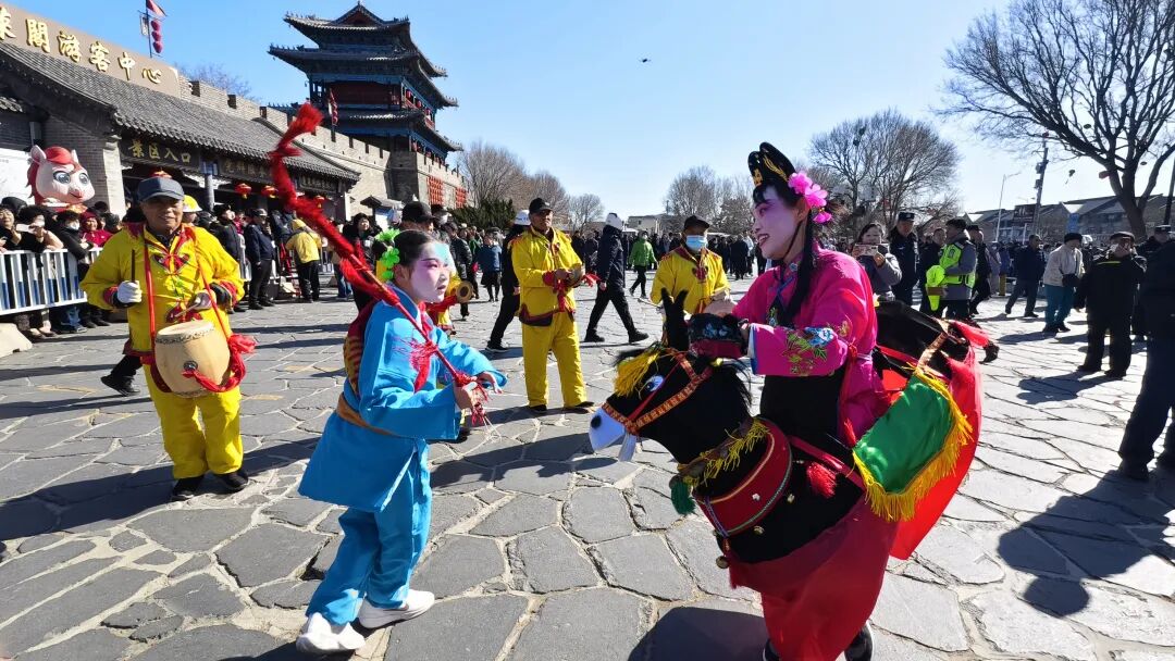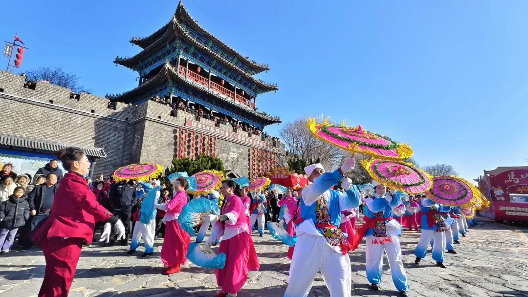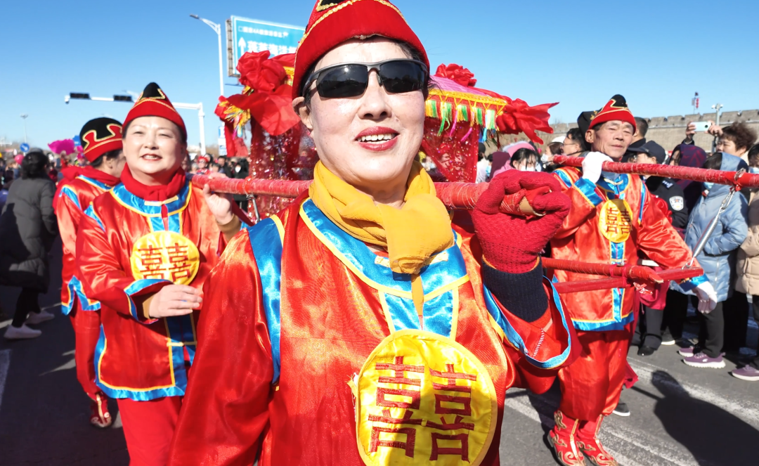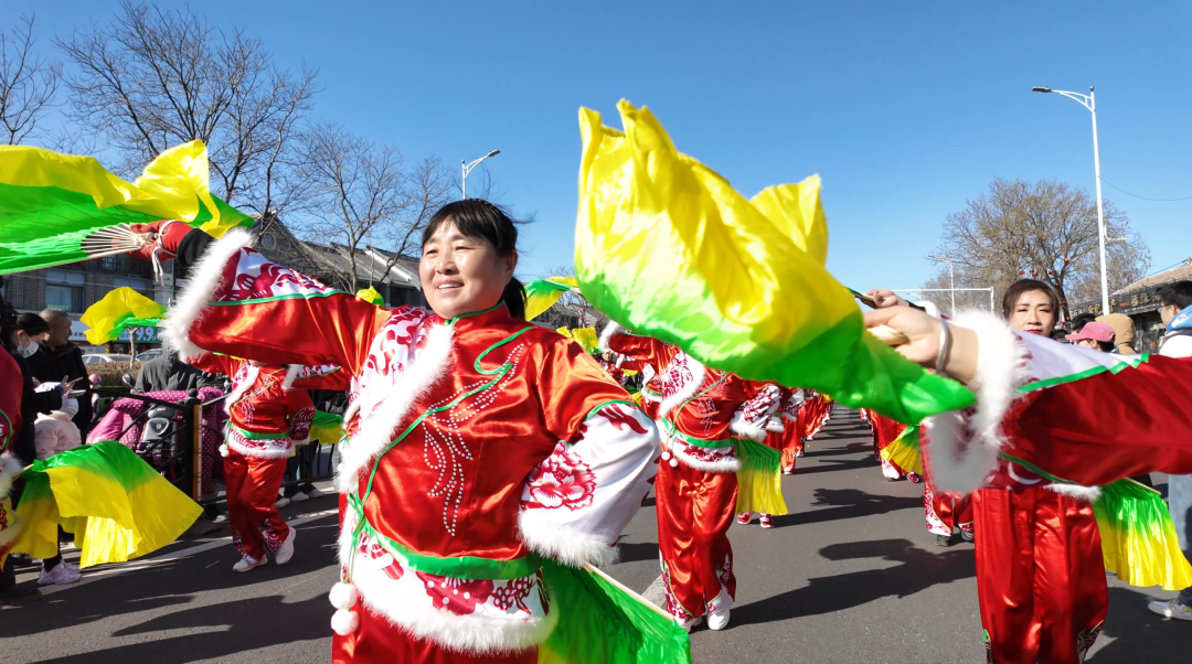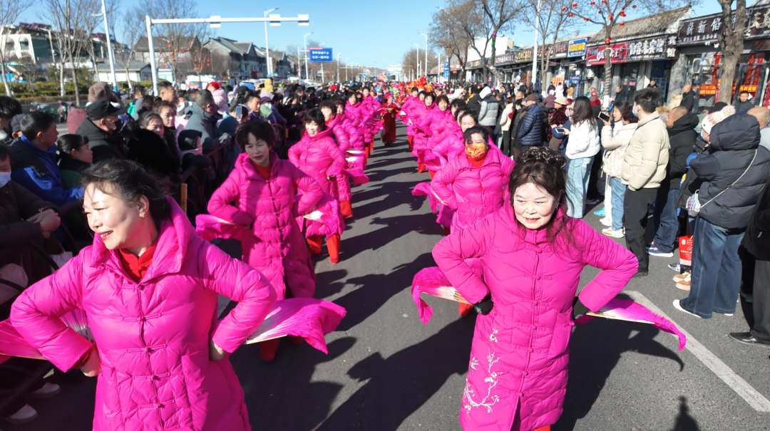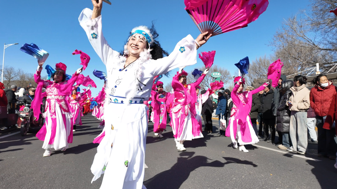 彩扇飞扬、舞步灵动,旱船毛驴、丑角小嫚、媒婆逗趣……诙谐幽默、欢乐拉满,引得观众阵阵喝彩。