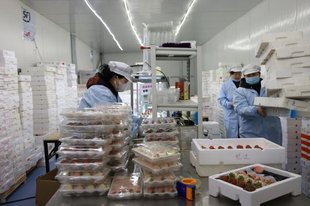 室外寒意未消,棚内暖意融融。一颗颗色泽鲜艳、个头饱满的草莓点缀在绿叶白花间,散发着清甜的香气。分拣台前,工人们正熟练地将清晨采摘的鲜果称重、打包,这些包装好的草莓,即将通过冷链运输,搭乘飞机,漂洋过海,出现在新加坡、泰国、迪拜等国家和地区的市场。