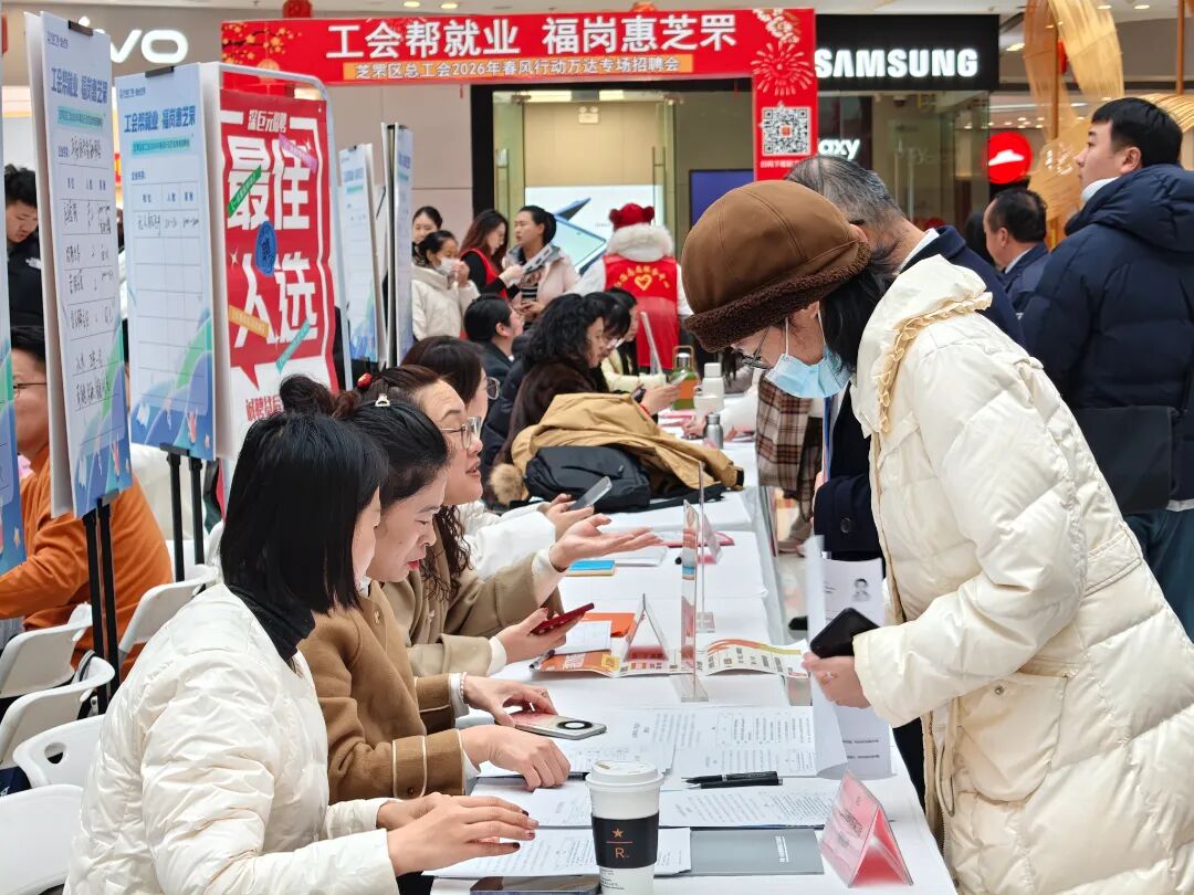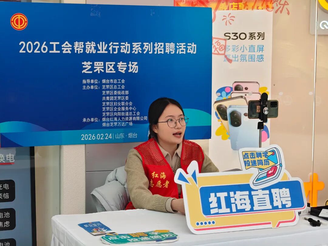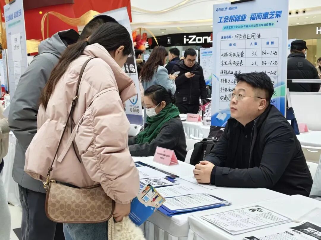 2月24日上午,芝罘区万达广场内人头攒动,芝罘区总工会联合区委统战部、团区委、区妇联、区企业服务中心及向阳街道总工会,在此举办“工会帮就业 福岗惠芝罘——2026年春风行动万达专场招聘会”。