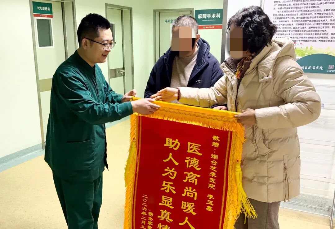 芝罘医院重症医学科医生李玉鑫接过锦旗