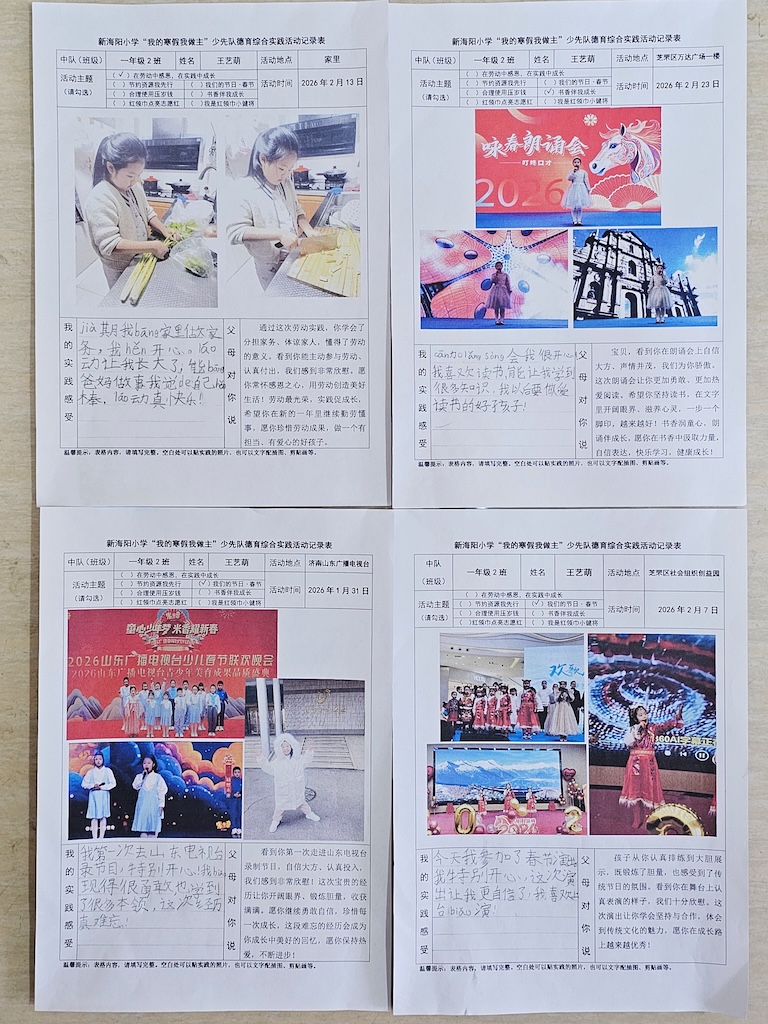 此次活动共含六大主题,孩子们踊跃参与,佳作频出,充分展现了新时代少年的风采与担当。“在劳动中感恩,在实践中成长”板块中,孩子们用照片、作文等方式记录做家务、学烹饪的瞬间,在劳动中体会父母辛劳,传承孝亲美德;“节约资源我先行”主题下,环保手工作品、节约小贴士创意十足,彰显了孩子们的环保理念;“合理使用压岁钱”作品中,孩子们分享理财小计划,树立正确的金钱观;“红领巾点亮志愿红”活动中,小志愿者们走进社区开展敬老、环保宣传等服务,用行动传递温暖;在“我们的节日·春节”作品里,孩子们在旅行中品味文化的韵味,用剪纸、年俗手抄报等作品将年味与传统文化完美融合;“书香伴我成长”主题下,孩子们通过读书心得、思维导图等方式,展现了自己的收获与感悟。
